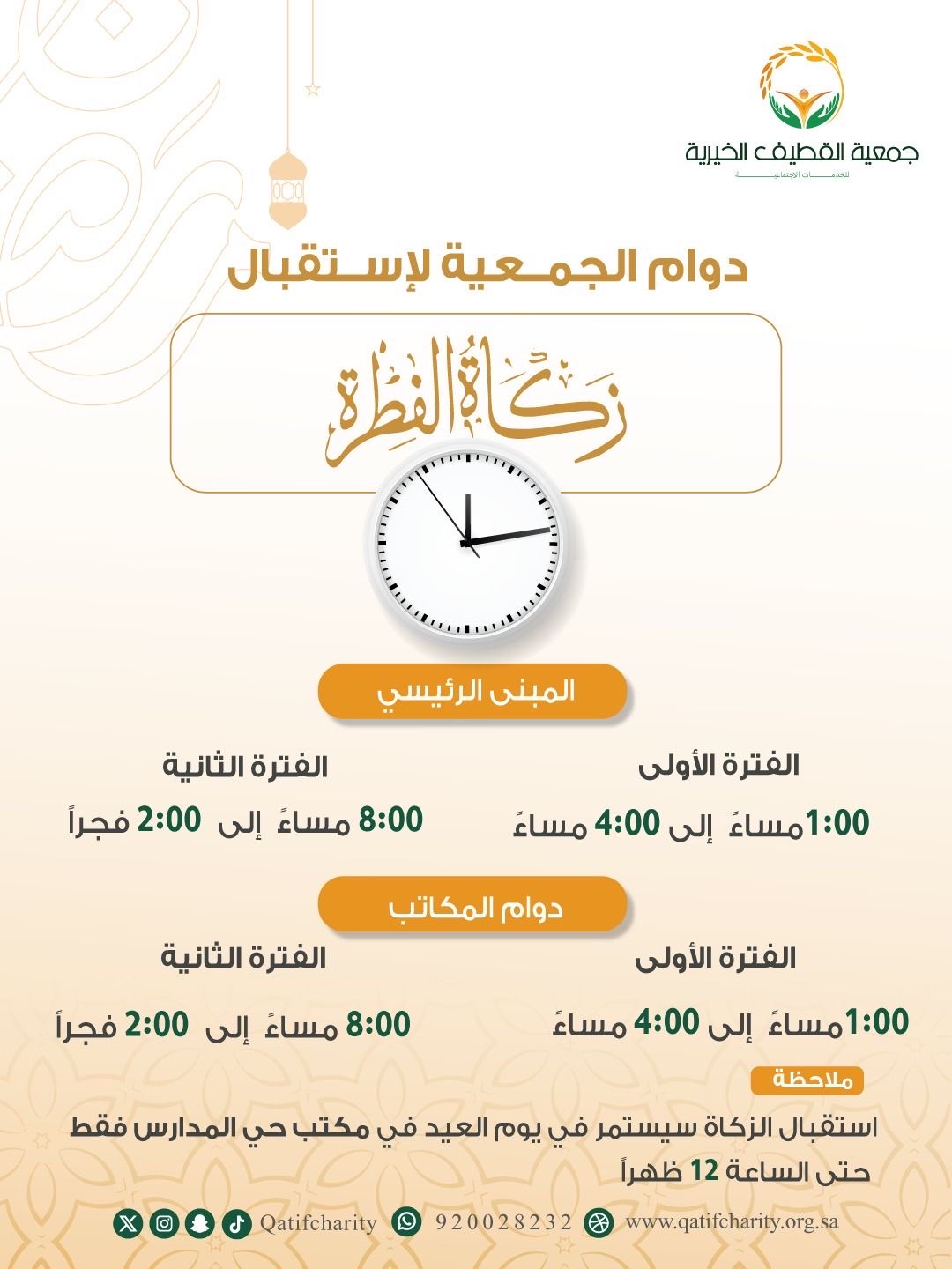 أعلنت جمعية القطيف الخيرية جاهزيتها التامة لاستقبال زكاة الفطرة لعام 1447 هـ عبر مسارات رقمية وحضورية متعددة، بهدف تيسير أداء الشعيرة وضمان وصولها للأسر المستحقة في وقتها الشرعي.