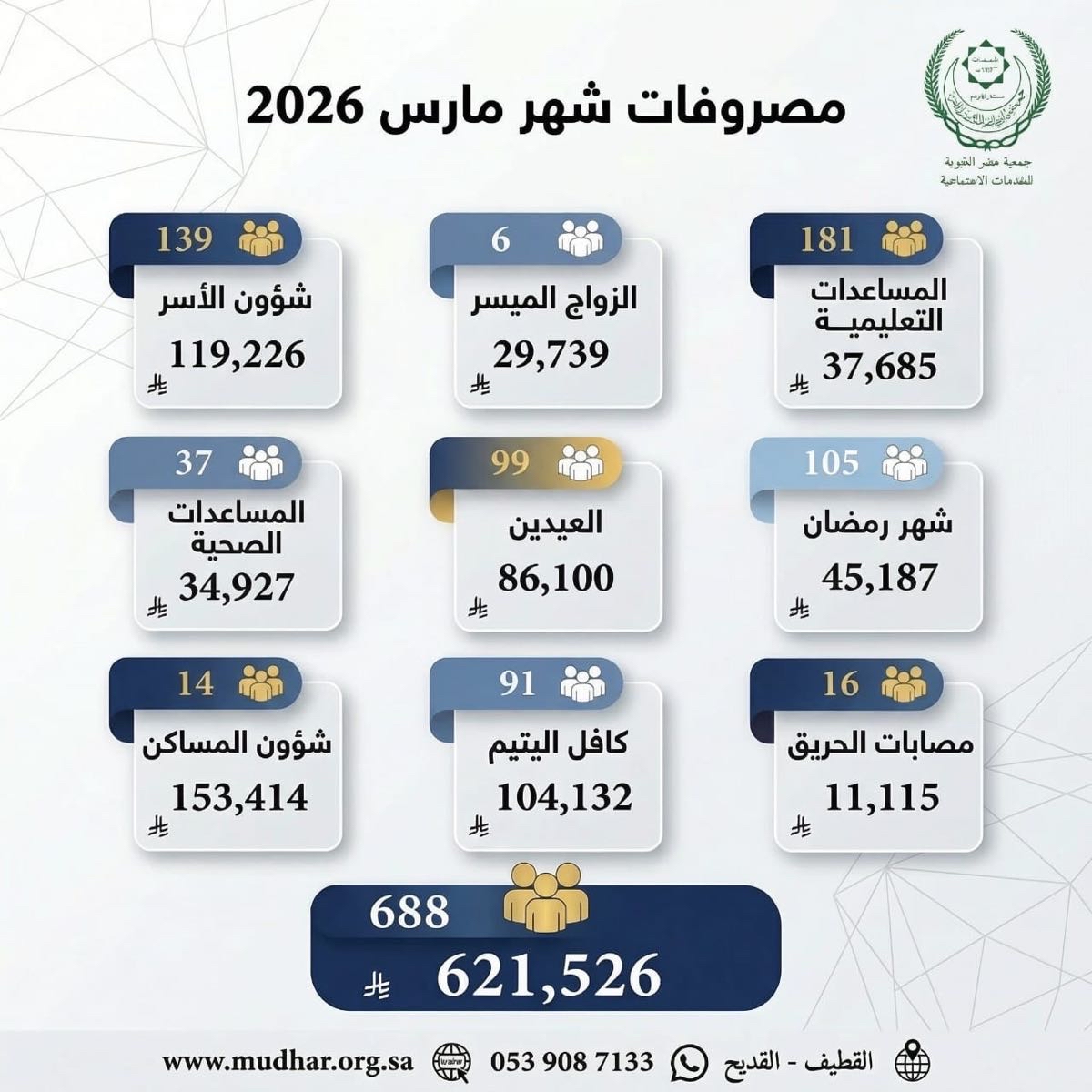 كشفت جمعية مضر الخيرية بالقديح،، عن ضخ 621,526 ريالاً لدعم 688 حالة مستحقة، وذلك عبر منظومة برامج رعوية وتنموية متكاملة تستهدف تحسين جودة حياة المستفيدين.