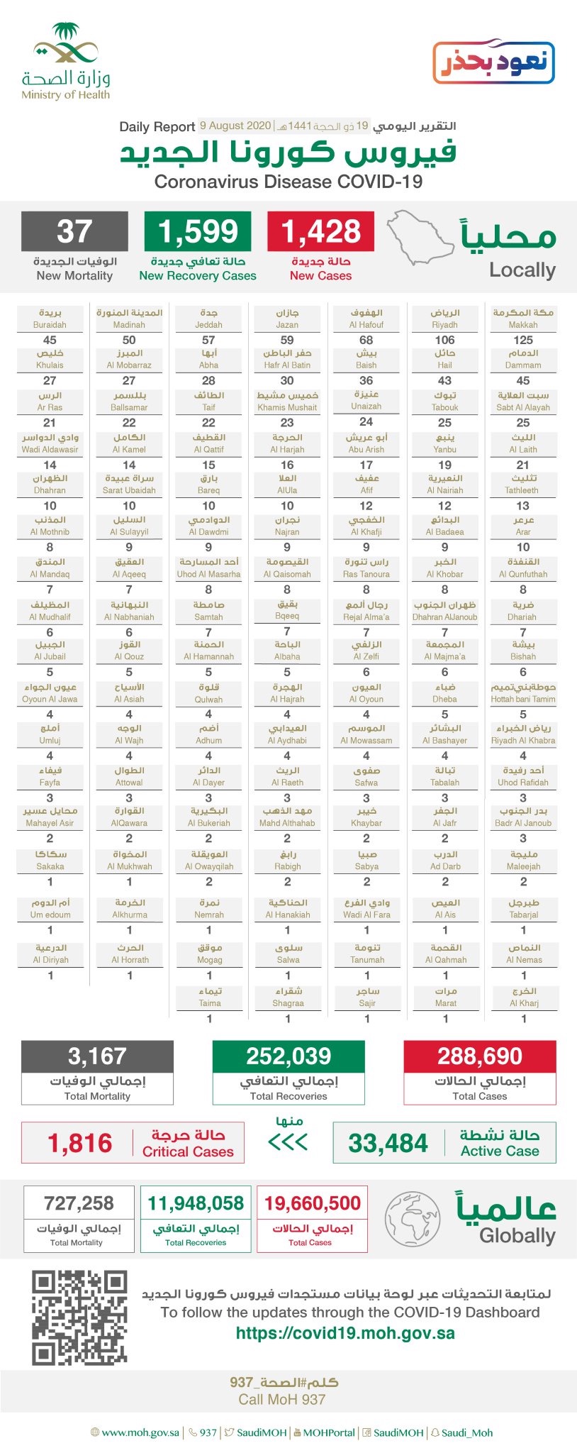وبينت ان عدد الحالات المؤكدة في المملكة ”288,690“ حالة، من بينها ”33,485“ حالة نشطة لاتزال تتلقى الرعاية الطبية، ومعظمهم حالتهم الصحية مطمئنة، منها ”1,828“ حالة حرجة.