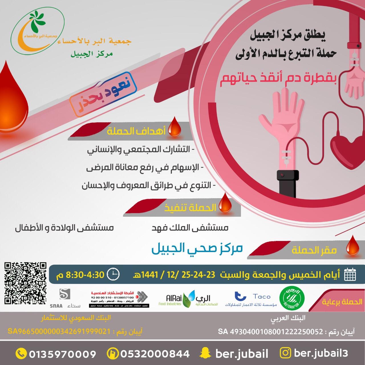 ينظم مركز الجبيل التابع لجمعية البر بالأحساء حملة التبرع بالدم الأولى بعنوان ”بقطرة دم أنقذ حياتهم“، على مدى ثلاثة أيام ابتداءً من يوم الخميس.