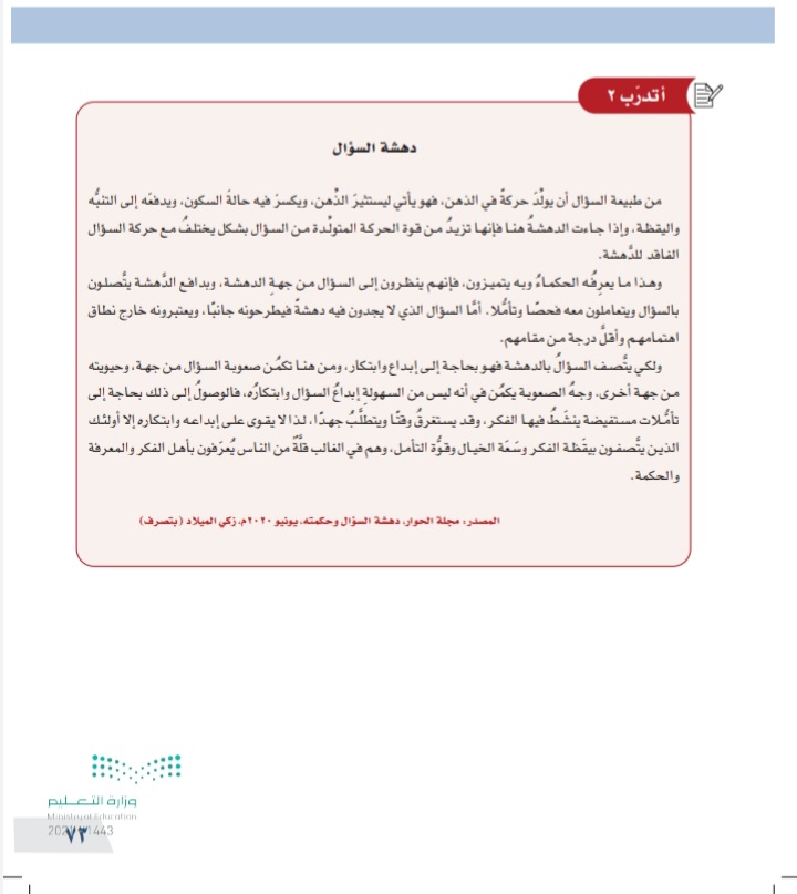 هذان النصان وردا في الدرس السادس من الوحدة الأولى، فقرة أتدرب، في الصفحتين 73 - 74، حمل الدرس عنوان: «التفكير الناقد وطرح الأسئلة»، وعلى ضوء هذين النصين وعنهما تم وضع ثلاثة أسئلة للمناقشة والتدريب.