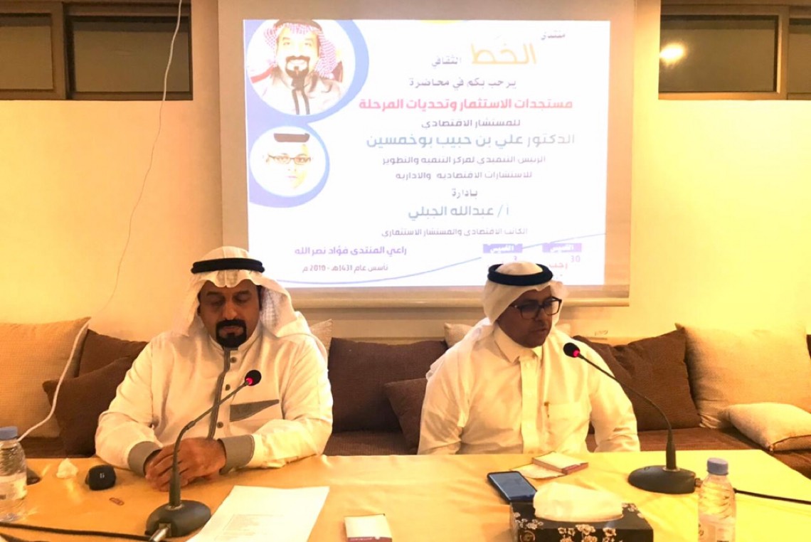 ألقى الدكتور علي حبيب بوخمسين محاضرة بمنتدى الخط الثقافي برعاية الإعلامي فؤاد نصرالله، وإدارة أ. عبدالله الجبلي تحت عنوان مستجدات الاستثمار وتحديات المرحلة.