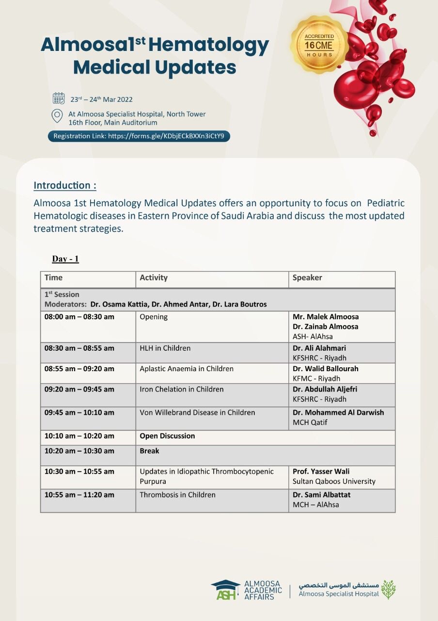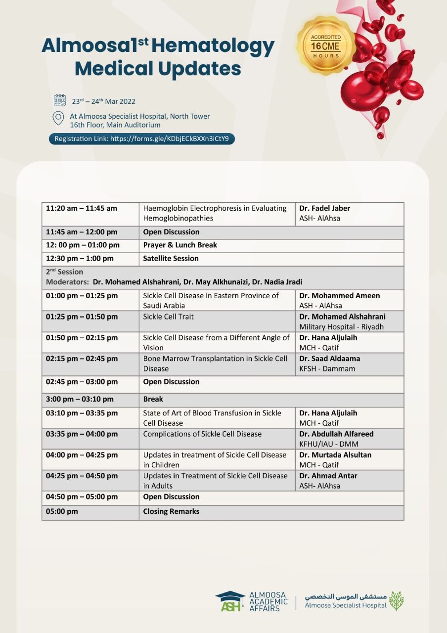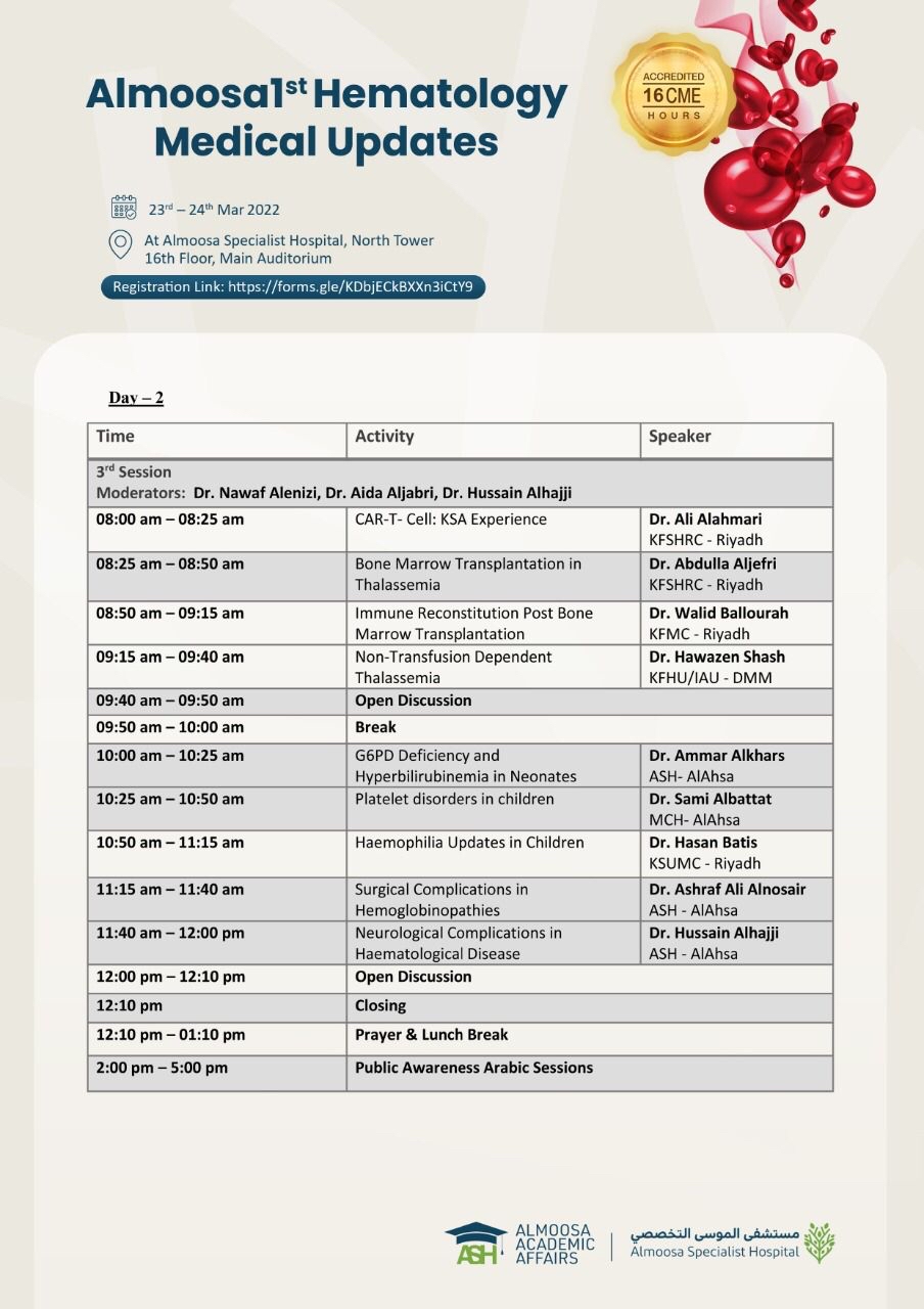 ودعت جميع الأطباء المتخصصين في أمراض الدم وأطباء الأطفال والممارسين الصحيين وطلاب كليات الطب للتسجيل وحضور المؤتمر المعتمد من الهيئة السعودية للتخصصات الصحية بعدد 16 ساعة علمية CME، وللاستفادة كذلك من الخبرات العلمية والطبية التي سينقلها المتحدثين إليهم من خلال المحاضرات والنقاشات العلمية التي ستشهدها الجلسات العلمية على مدار اليومين.