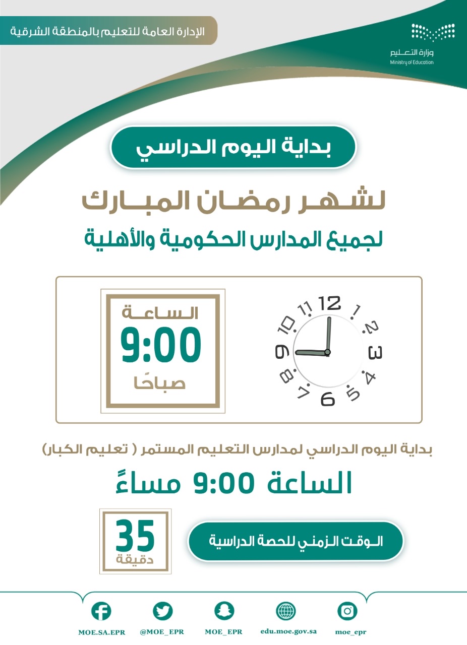وستكون بداية اليوم الدراسي لشهر رمضان لجميع المدارس الحكومية والأهلية الساعة التاسعة صباحًا؛ بينما ستكون بداية اليوم الدراسي لمدارس التعليم المستمر ”تعليم الكبار“ الساعة التاسعة مساء والوقت الزمني للحصة 35 دقيقة.