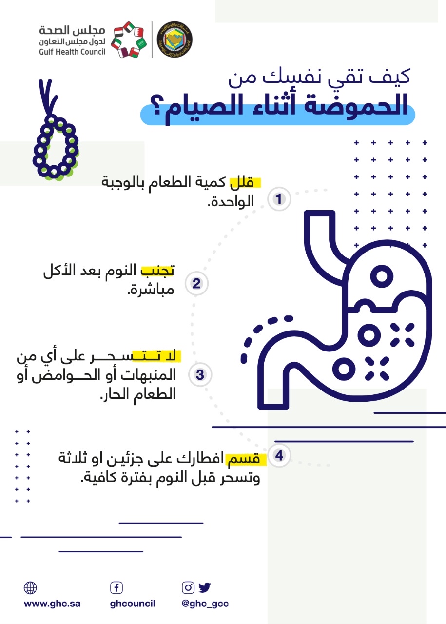 نشر مجلس الصحة لدول مجلس التعاون عبر حساباته الرسمي في مواقع التواصل الاجتماعي تصميم «إنفوجرافيك» يوضح أربع نصائح من خلالها تستطيع أن تقي نفسك من الحموضة أثناء الصيام في رمضان.