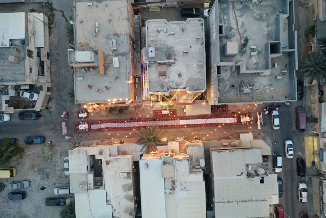 وأوضح بأنه تم فرش الشارع بين الأحياء بإضاءة وزينة بسيطة ومتواضعة، قائلًا ”القصد ليش الأكل ولكن التجمع حيث انبثقت الفكرة بين أهالي حي البسيتين بأم الحمام“.