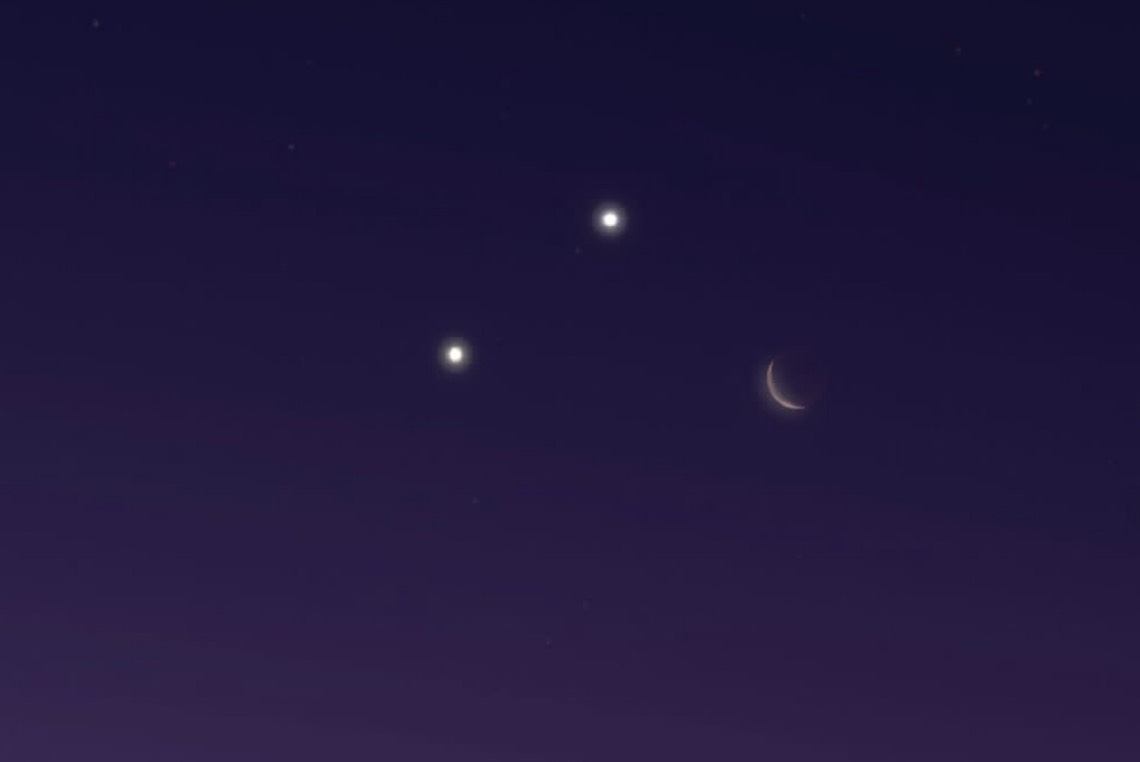 يرصد قبل شروق الشمس يوم الاربعاء هلال القمر في حالة اقتران مع كوكب الزهرة حيث سيفصل بينهما 3 درجات بالأفق الجنوبي الشرقي وستنتظم في مثلث سماوي مع كوكب المشتري مشاهد بالعين المجردة.