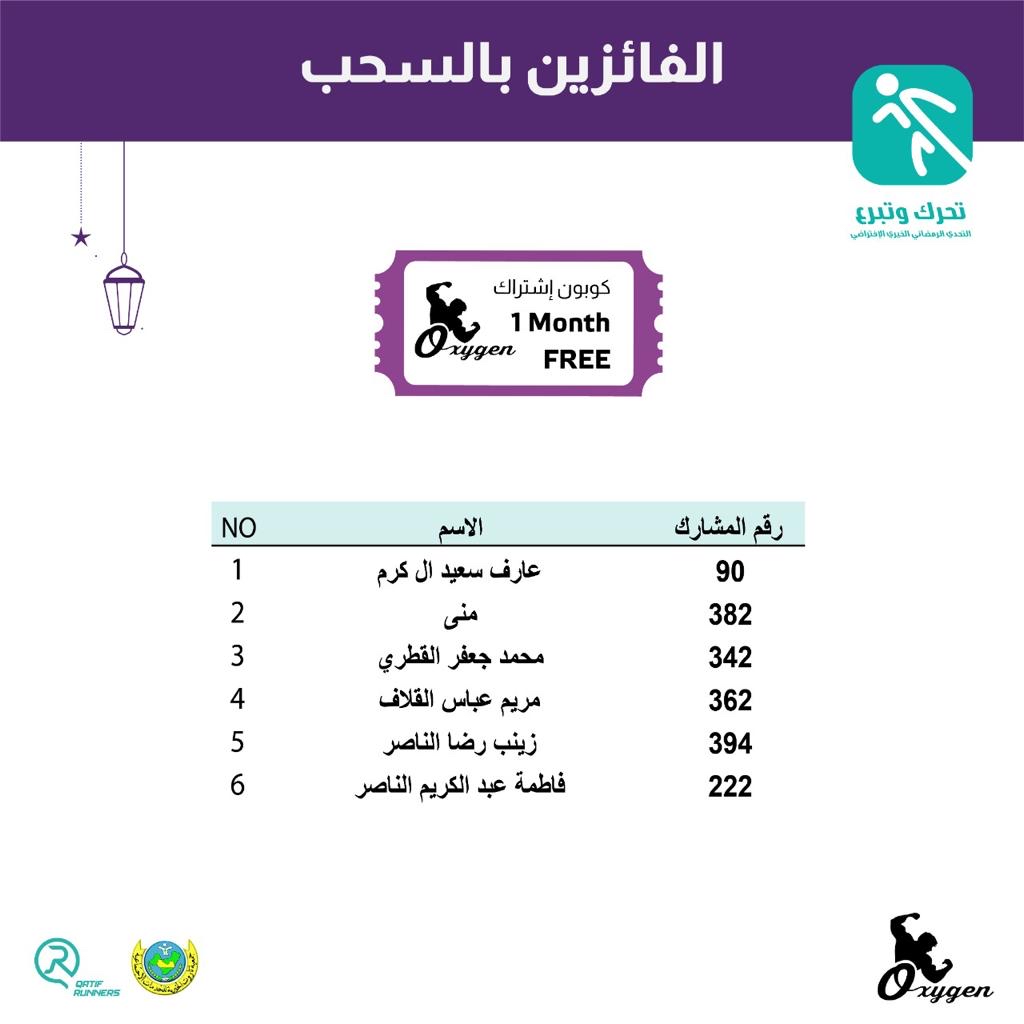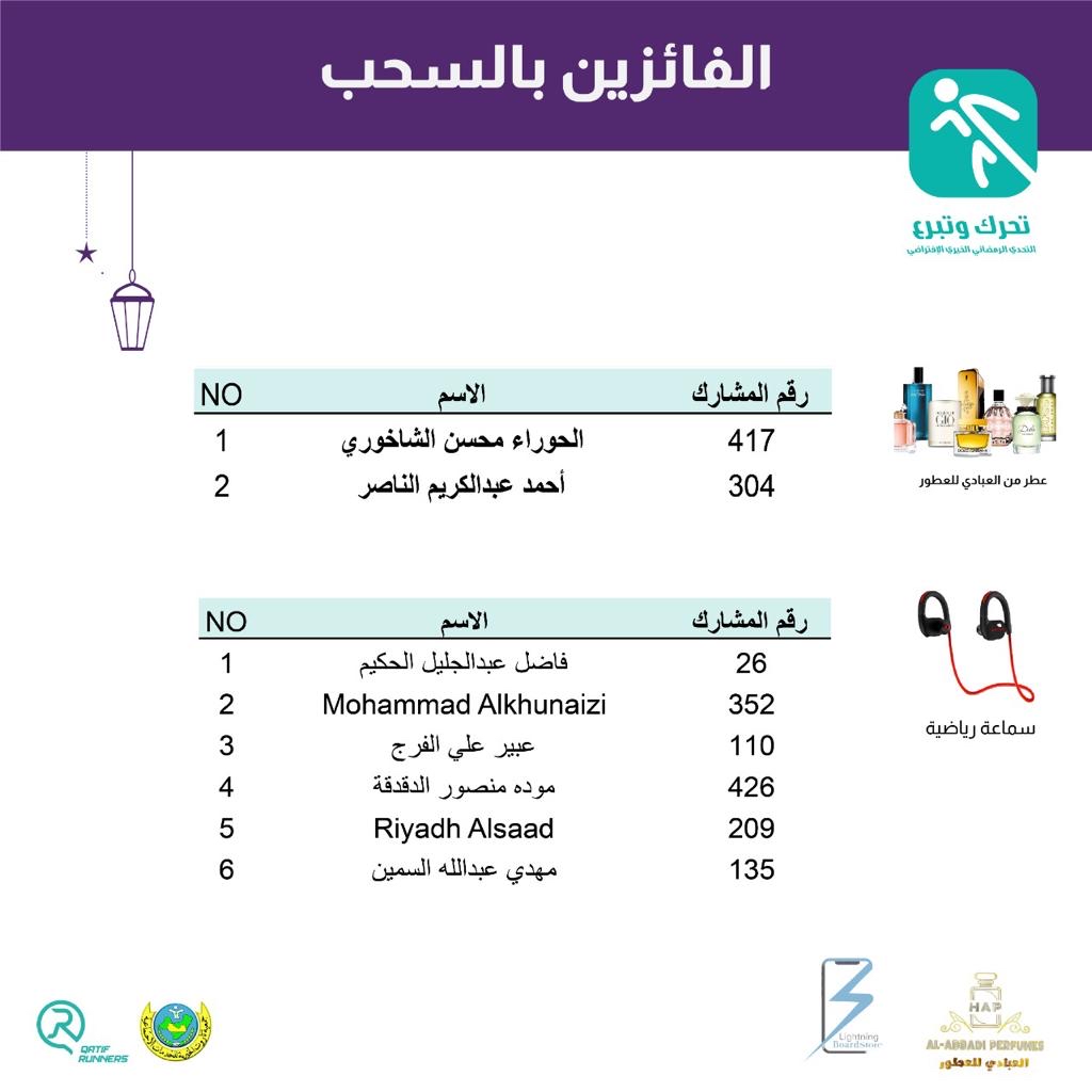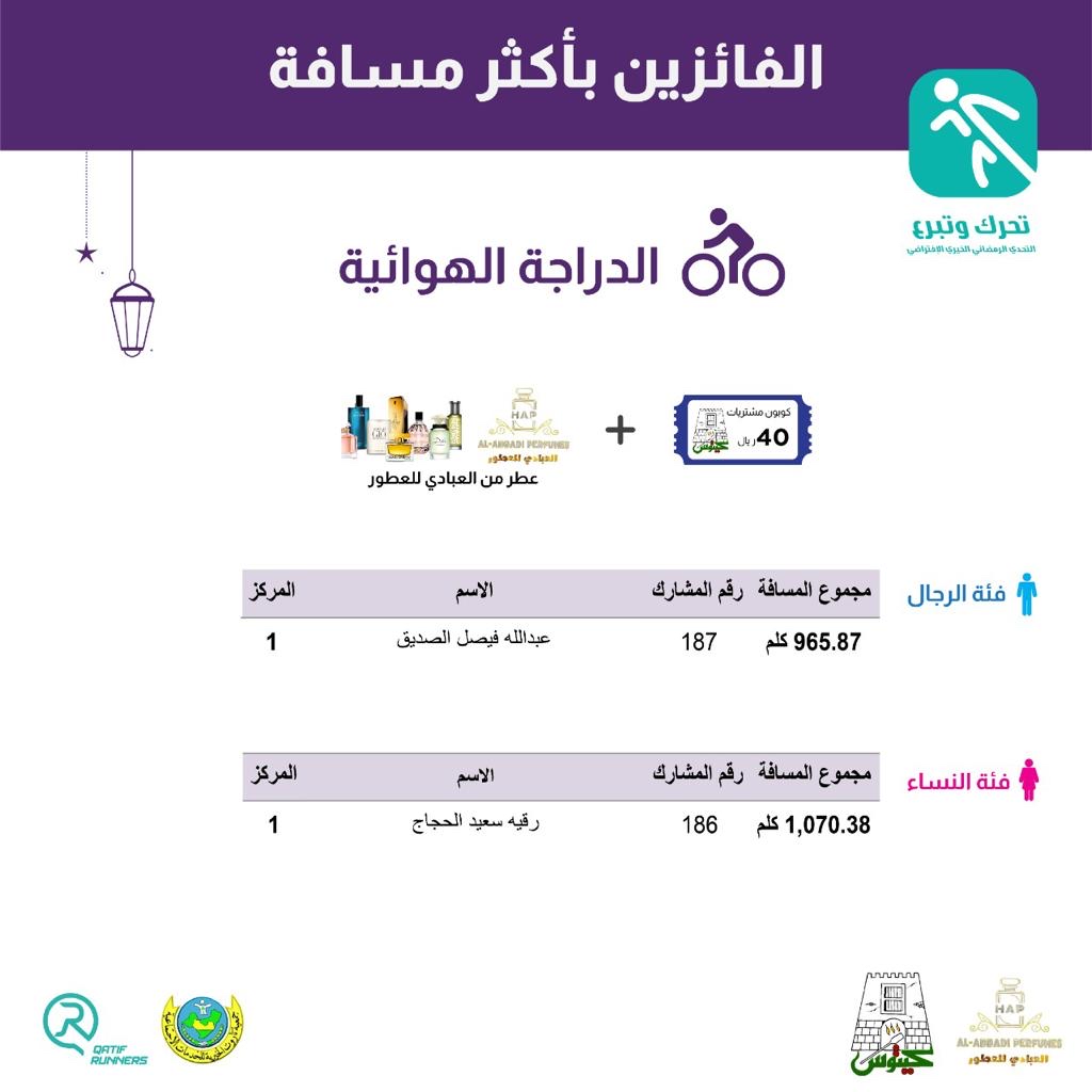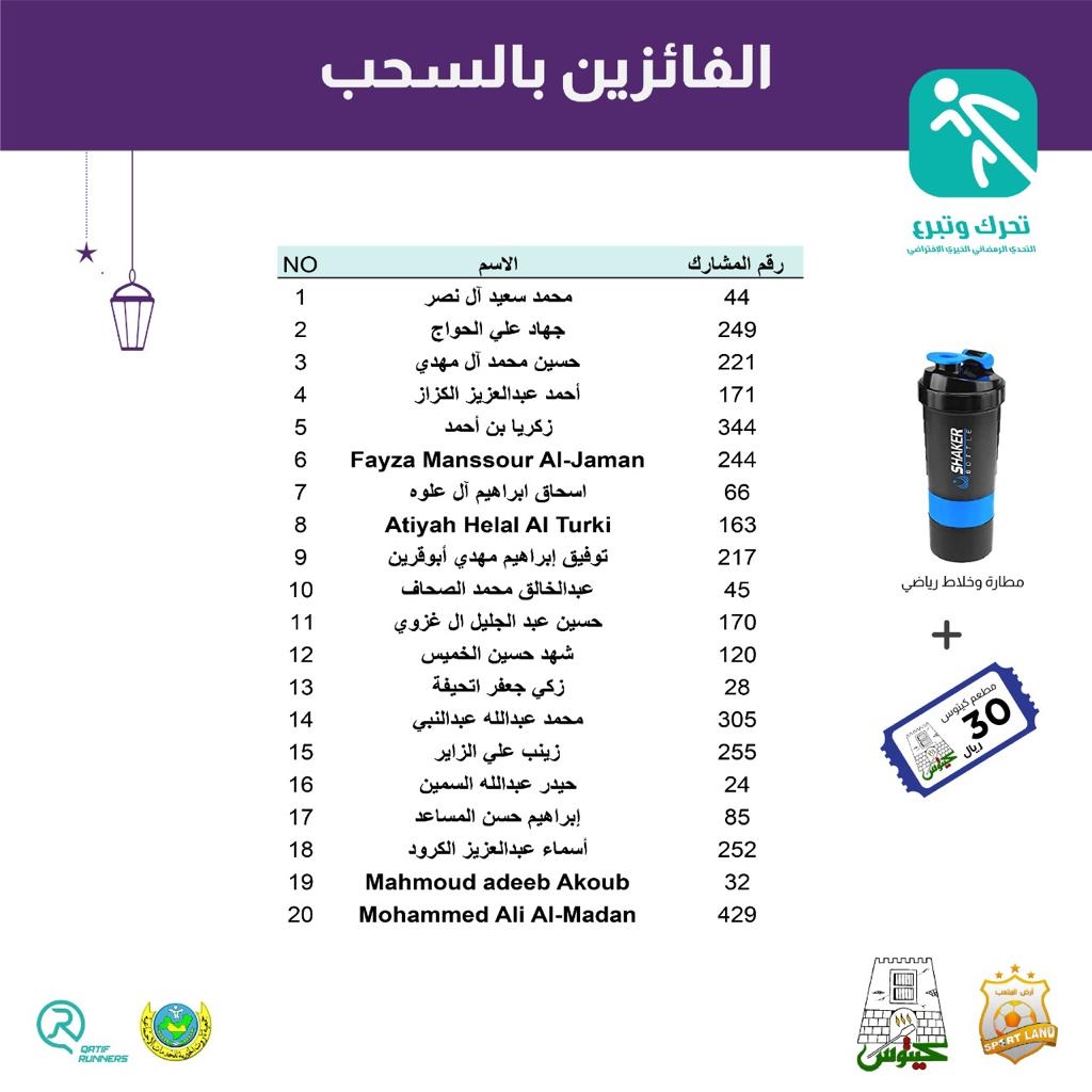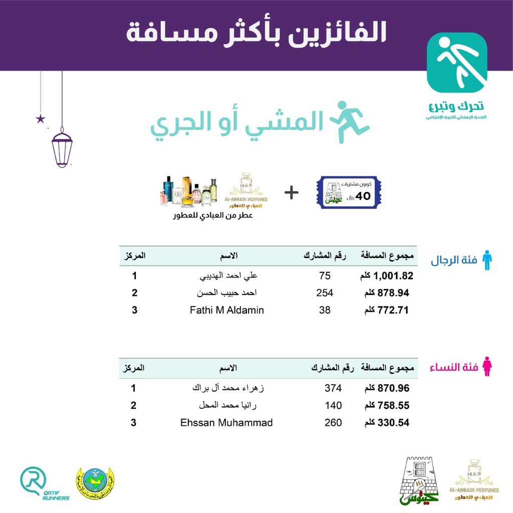 يُذكر أن المبادرة بدأت منذ أول يوم من شهر رمضان المبارك، وتم السحب على أكثر من 40 جائزة وأُعلن عن الفائزين بأكثر مسافة قطعت من فئة الرجال والنساء في بث مباشر على صفحة «عدائي القطيف» في الإنستغرام.