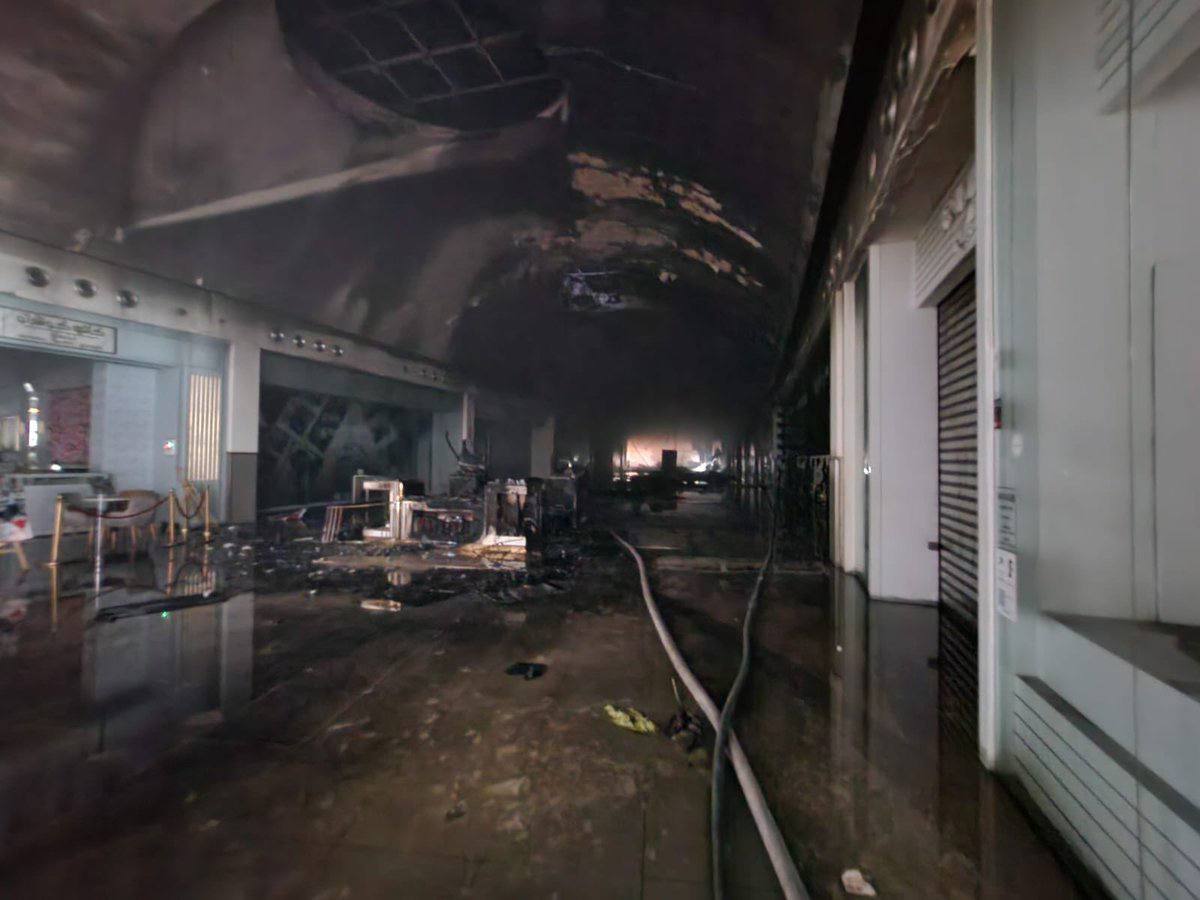 واشتعلت النيران في مساحة كبيرة من المجمع حتى وصلت إلى ثلاث بوابات رئيسية، دون وقوع إصابات بشرية.