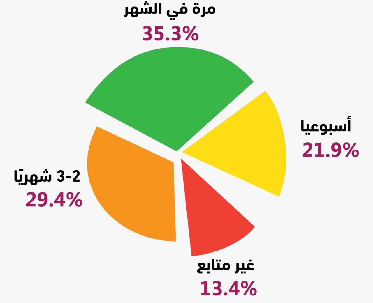 ومن ناحية متابعة برامج المنتدى، كشفت الدراسة أن أكثر المشاركين ”35%“ يحضرون البرامج مرة واحدة في الشهر، بينما يحضر ما نسبته 29% مرتين إلى ثلاث مرات شهريا، ويشكل من يحضر أسبوعيا منهم حوالي 22%.