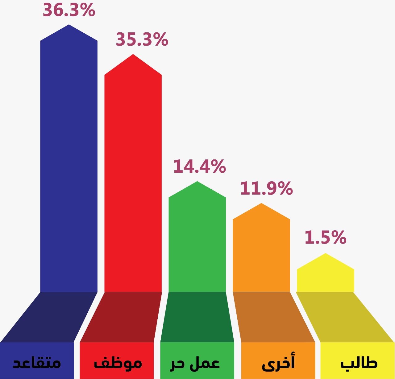وأضافت: جاء تصنيف المشاركين في الاستطلاع بصورة متوازنة من ناحية الجنس 25% إناث مقابل 75% ذكور، وأن حوالي 61% من الفئة العمرية أكبر من 50 سنة، و31% من المشاركين بين 36-50 سنة، وأن أعلى نسبة في تصنيف المهن هم المتقاعدون والموظفون ”36% لكل فئة“.