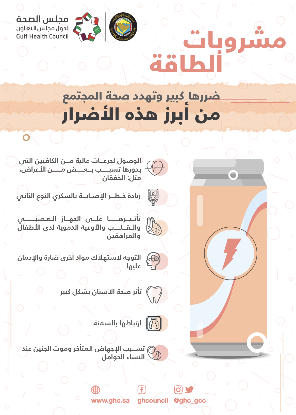 واردف المجلس بان تناول مشروبات الطاقة بشكل مستمر له تأثير كبير على صحة الأسنان إضافة إلى ارتباطه بالسمنة، وأنه يتسبب بالإجهاض المتأخر وموت الجنين عند النساء الحوامل لاسمح الله.