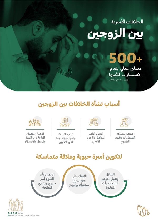 وأوضح المجلس أن أسباب نشأة الخلافات بين الزوجين تتمثل في: ضعف مشاركة الاهتمامات وتقدير الطموح، وانعدام أواصر التواصل والحوار الأسري، وغياب القناعة ونمو المقارنات بما لدى الآخرين، والإهمال وفقدان الموازنة بين الأسرة والعمل والأصدقاء.