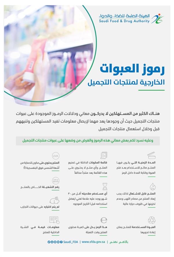أوضحت الهيئة العامة للغذاء والدواء معاني ودلالات مجموعة من الرموز الموجودة على العبوات الخارجية لمنتجات التجميل.