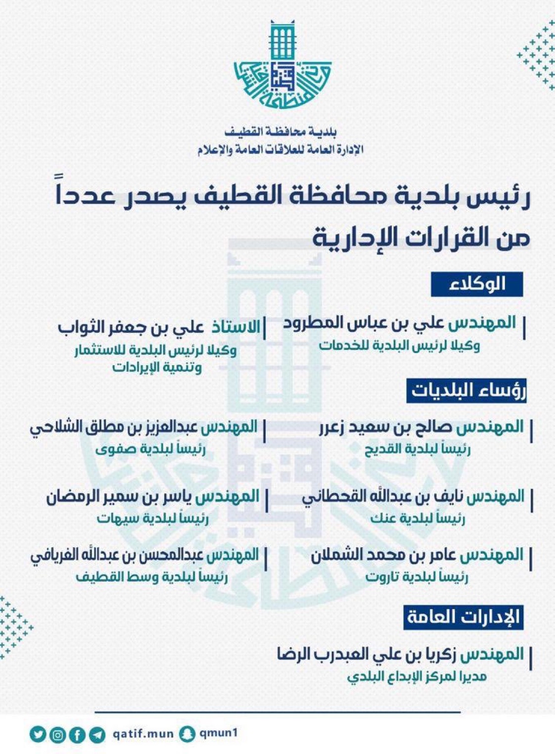 تضمّنت القرارات الصادرة تكليف كل من م. علي المطرود وكيلًا لرئيس البلدية للخدمات، وعلي الثواب وكيلًا لرئيس البلدية للاستثمار وتنمية الإيرادات، وم. صالح زعرر رئيسًا لبلدية القديح، وم. عبدالعزيز الشلاحي رئيسًا لبلدية صفوى، وم. نايف القحطاني رئيسًا لبلدية عنك، وم. ياسر الرمضان رئيسًا لبلدية سيهات، وم. عامر الشملان رئيسًا لبلدية تاروت، وم. عبدالمحسن الغريافي رئيسًا لبلدية وسط القطيف، وزكريا العبدرب الرضا مديرًا لمركز الإبداع البلدي.