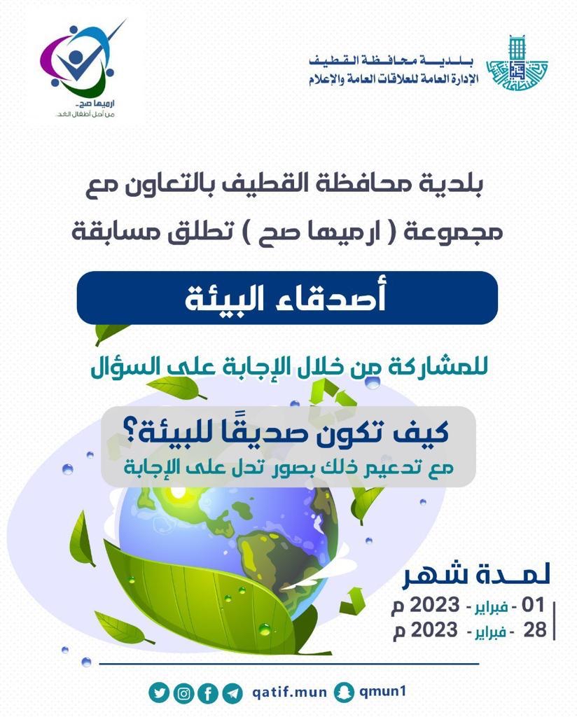 تشترط المرحلة الأولى لمسابقة ”أصدقاء البيئة“، التي نظمتها بلدية محافظة القطيف، بالتعاون مع مجموعة ”ارميها صح“ التطوعية، الإجابة على سؤال ”كيف تكون صديقًا للبيئة؟“، مع تدعيم ذلك بصور تدل على الإجابة واستحقاق لقب صديق البيئة.