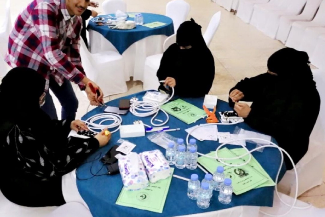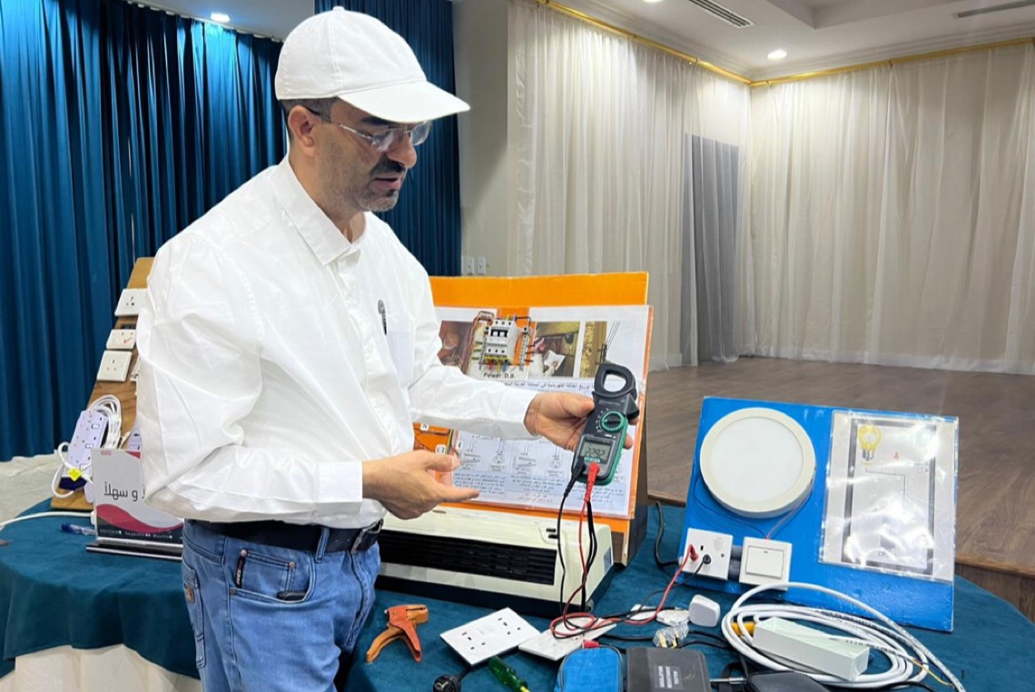 درب فريق ”مسعفون بلا حدود“ التطوعي، 20 شخصًا من الرجال والسيدات، في ورشة عمل بعنوان ”مبادئ السلامة المنزلية“ على السلامة الكهربائية.
