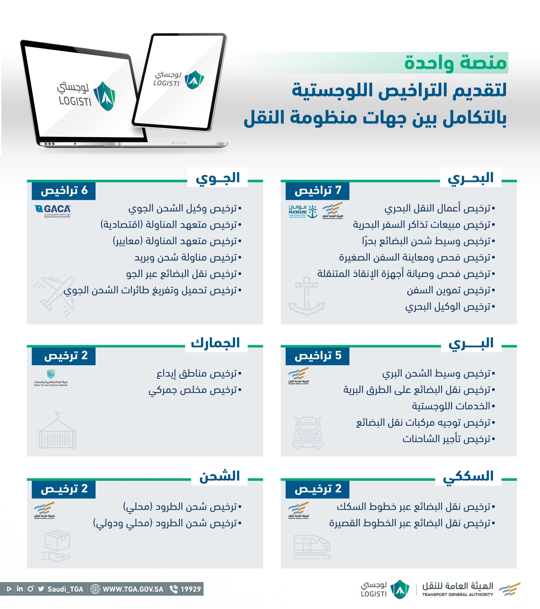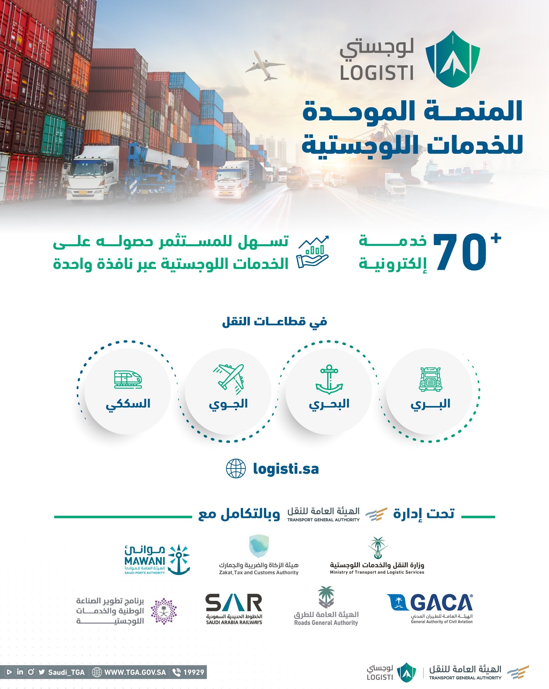 وتأتي منصة ”لوجستي“ بالتعاون مع برنامج تطوير الصناعات الوطنية والخدمات اللوجستية، ووزارة النقل والخدمات اللوجستية، والهيئة العامة للطيران المدني، والهيئة العامة للزكاة والضريبة والجمارك، والهيئة العامة للموانئ، والهيئة العامة للطرق، وشركة الخطوط الحديدية ”سار“.