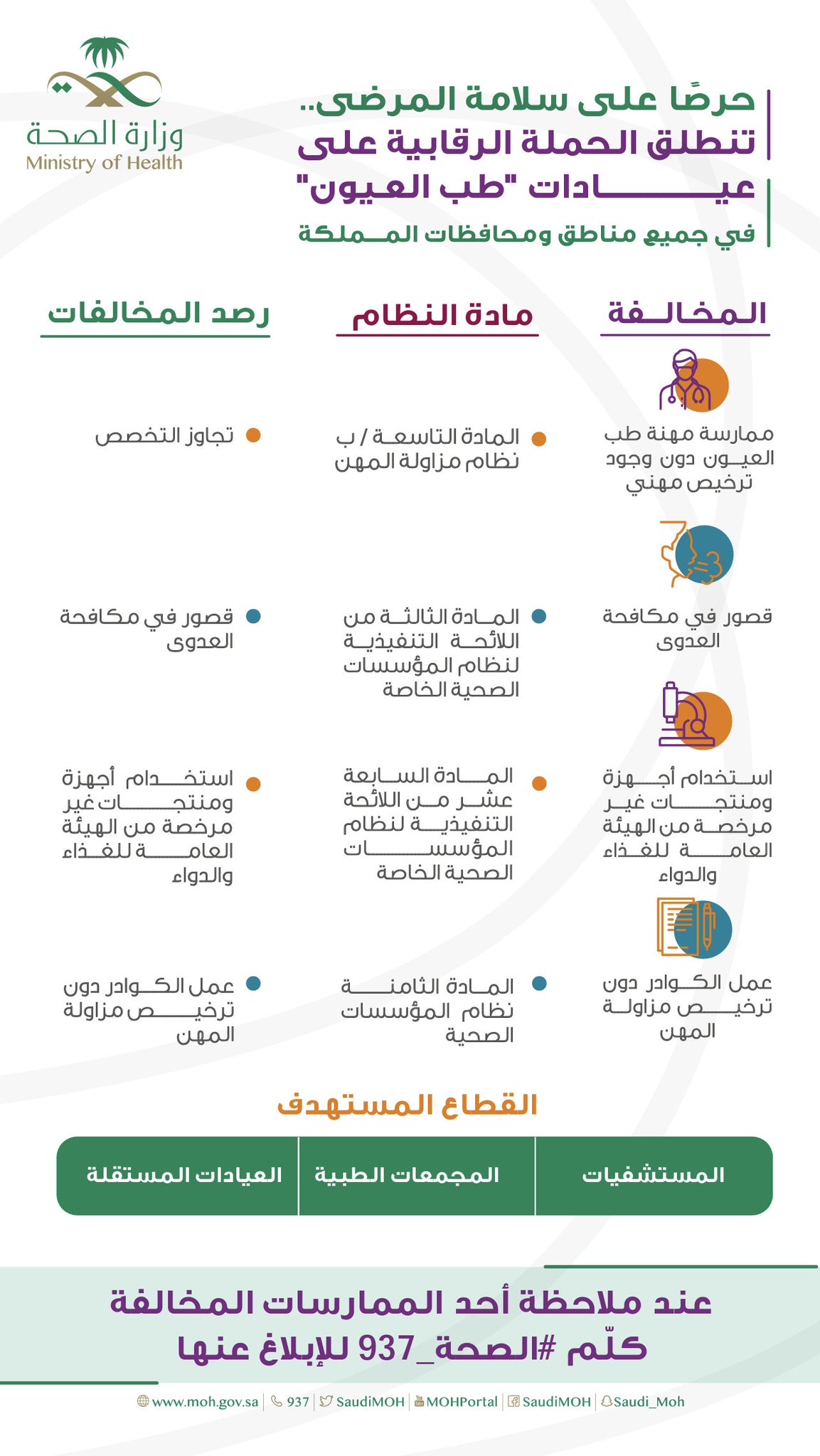 وقالت الوزارة إن الحملة ستعمل على رصد مخالفات ممارسة مهنة طب العيون دون ترخيص مهني، والقصور في مكافحة العدوى، واستخدام أجهزة ومنتجات غير مرخصة من الهيئة العامة للغذاء والدواء، ومخالفة عمل الكوادر دون ترخيص مزاولة المهن.