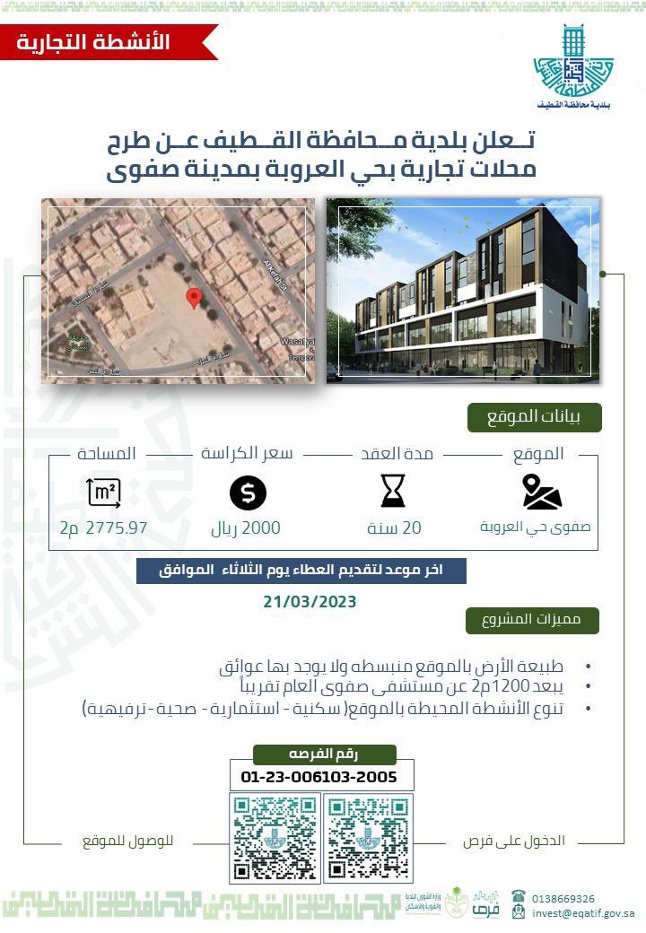 طرحت بلدية القطيف فرصا استثمارية مميزة لمحلات تجارية في مدينة صفوى بحي العروبة بمساحة 2775 متر مربع وبعقد لمدة 20 سنة.