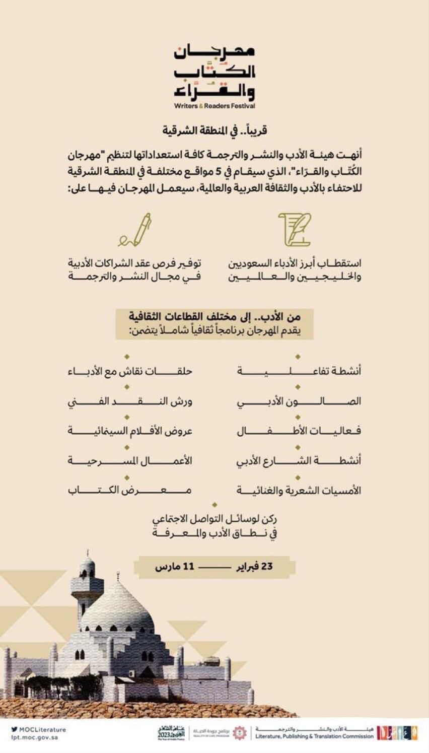أنهت هيئة الأدب والنشر والترجمة، كافة استعداداتها لتنظيم ”مهرجان الكتاب والقراء“، الذي يقام بدءًا من يوم 23 فبراير الجاري إلى 11 مارس المقبل، في 5 مواقع بالمنطقة الشرقية؛ للاحتفاء بالأدب والثقافة العربية والعالمية.