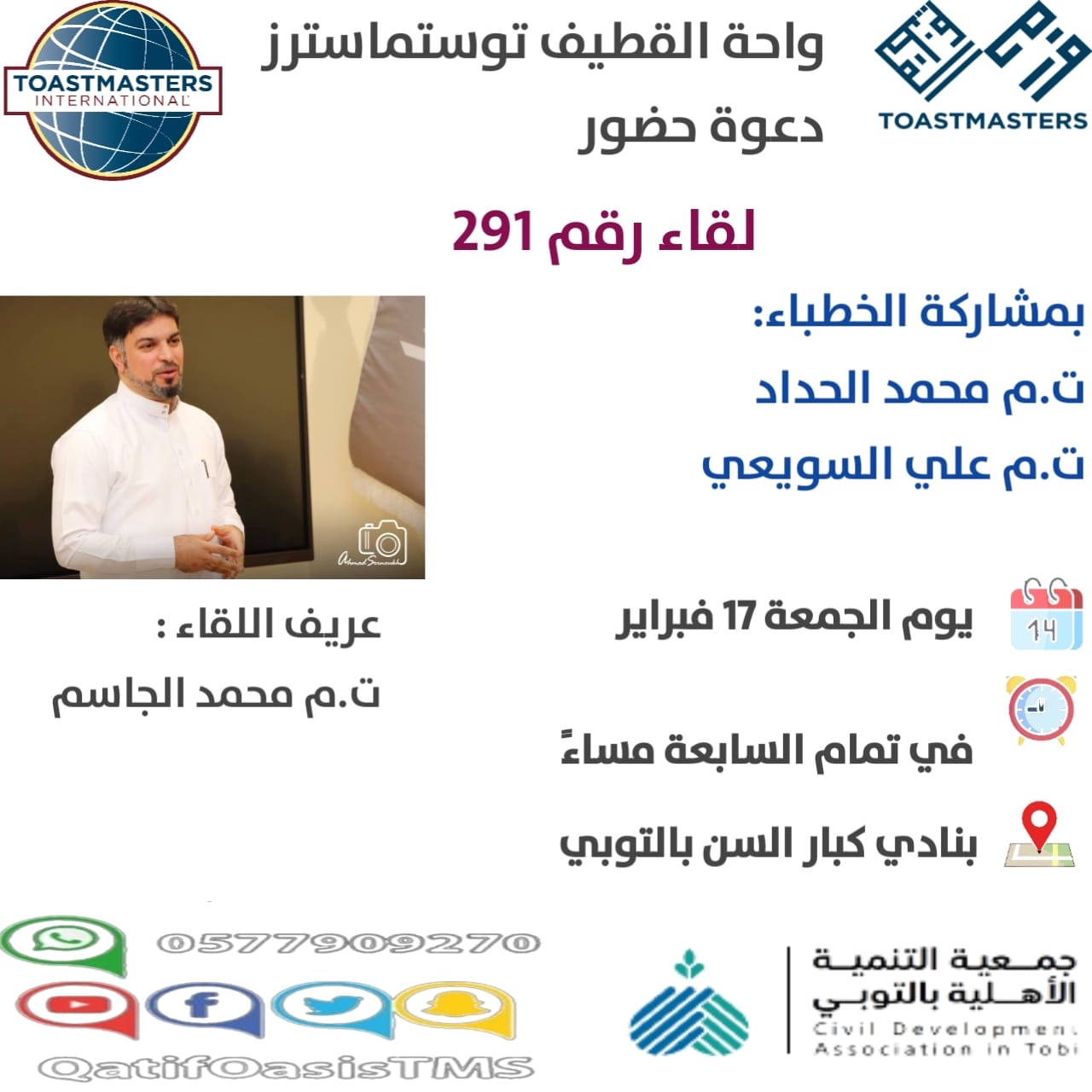 ينظم نادي واحة القطيف ”توستماسترز“ لقائه رقم 291، في تمام السابعة من مساء غدٍ الجمعة، في نادي كبار السن في التوبي.