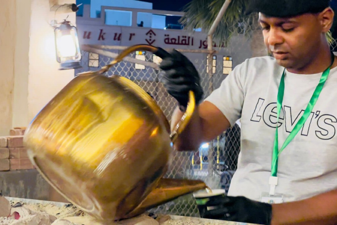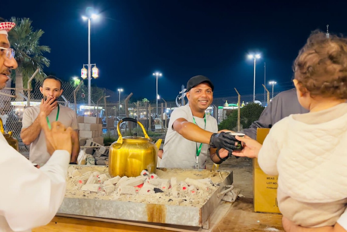جذب مُقدم الضيافة في مبادرة «بستان قصر تاروت» راكان آل شوكان، انتباه الحضور، بترحيبه الحار بالضيوف، حيث يخدم أكثر من 10 آلاف من الزوار، يسقيهم الشاي والكرك والدارسين والنعناع والليمون والزنجبيل.