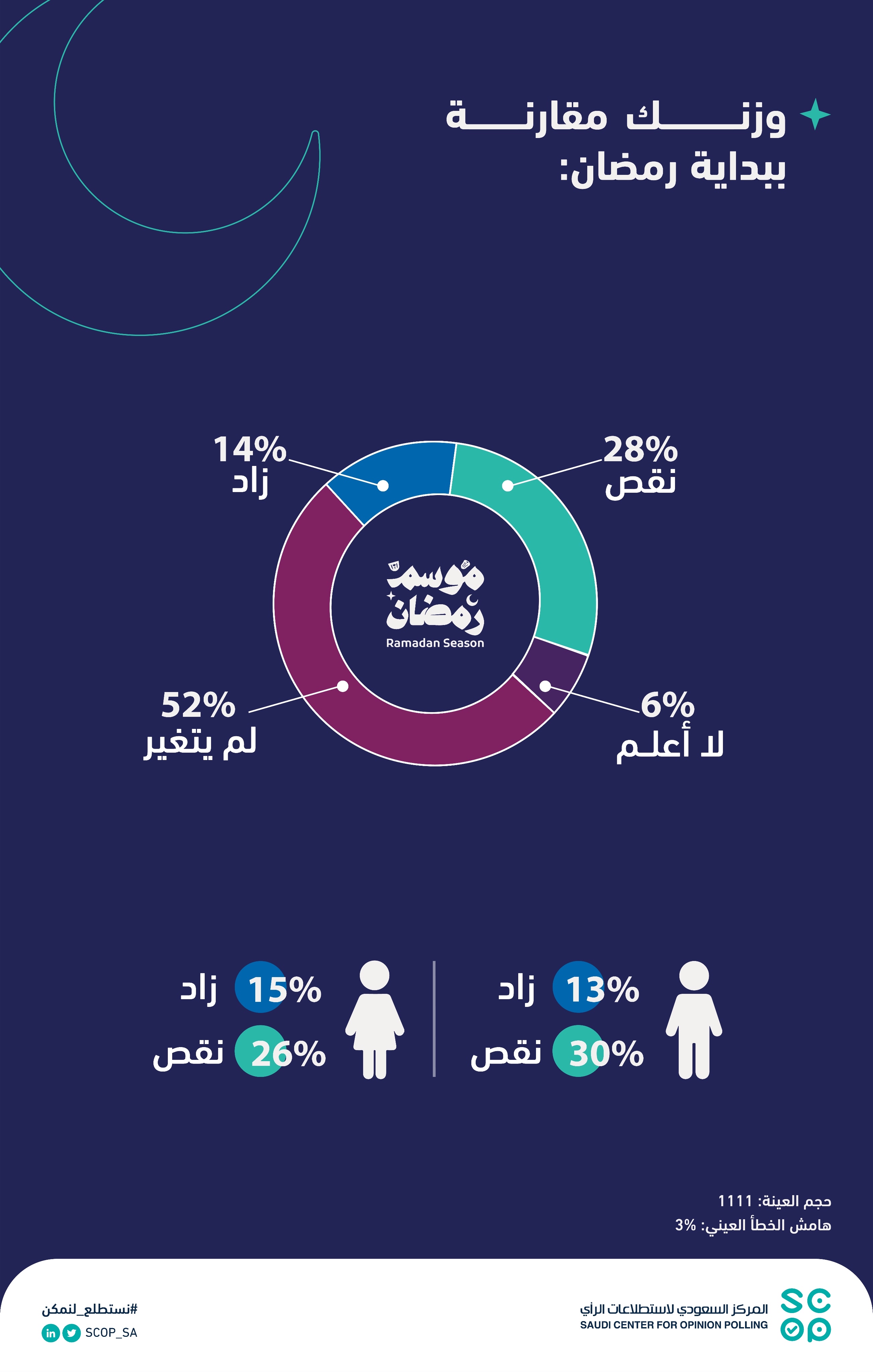 وفي سياق متصل، كشف استطلاع آخر، عن زيادة وزن 14% من المسطلعة آرائهم، خلال شهر رمضان بينما نقص وزن 28% من المشاركين في الاستطلاع، ولم تتغير حالة 52% منهم، وأجاب 6% ب «أعلم».