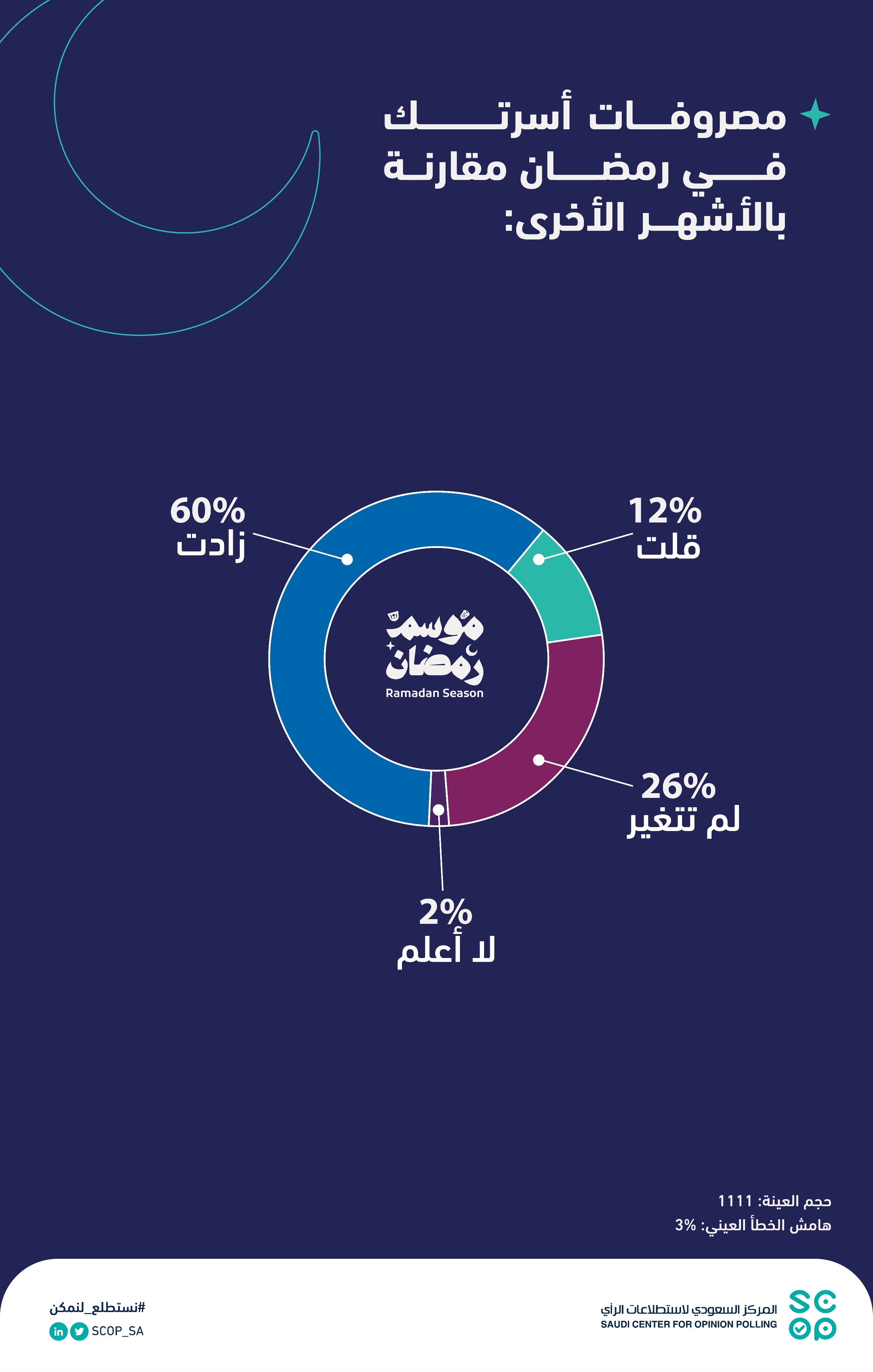 أظهر نتائج استطلاع للرأي أن 60% من السعوديين زادت نفقاتهم خلل شهر رمضان المبارك مقارنة بالعام الماضي.