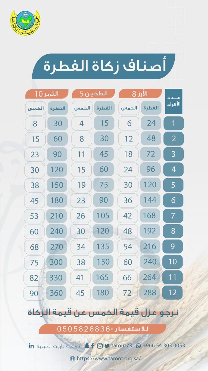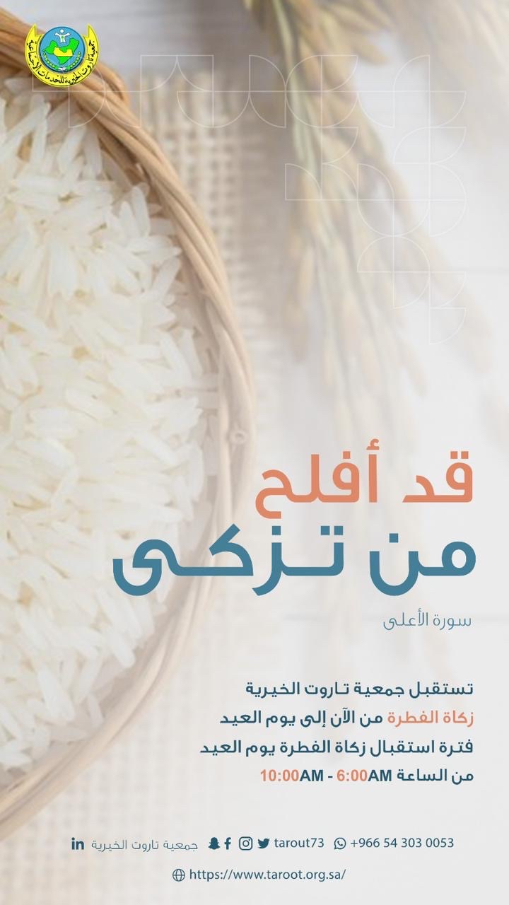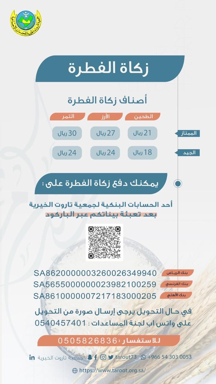 بدأت جمعية تاروت الخيرية، استقبال زكاة الفطرة، ابتداء من الثلاثاء 27 رمضان 1444 هـ، وحتى نهاية الشهر الكريم.