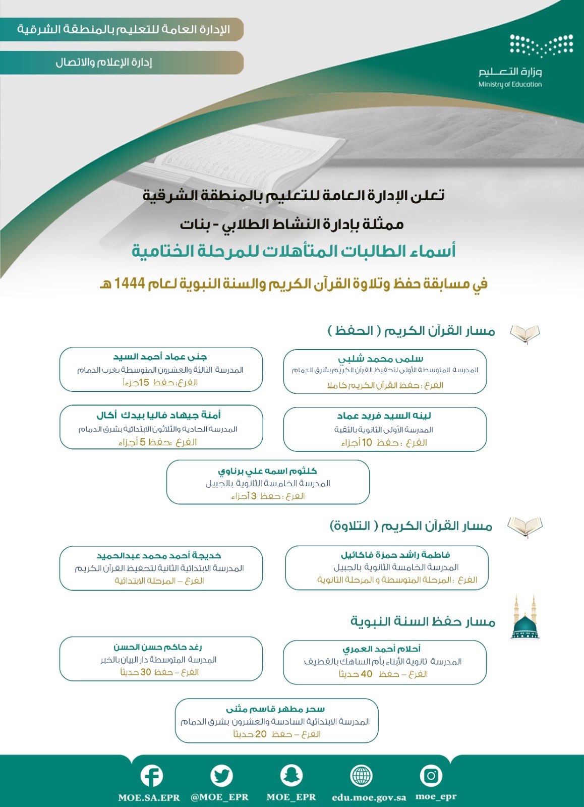 وحققت خمسة طالبات المراكز الأولى في مسار حفظ القرآن الكريم، وهن على الترتيب: سلمي محمد شلبي بالمدرسة المتوسطة الأولى شرق الدمام، وفي المركز الثاني جنى عماد أحمد السيد بالمدرسة الثالثة والعشرون المتوسطة بغرب الدمام، وفي المركز الثالث لينة السيد فريد عماد بالمدرسة الأولى الثانوية بالثقبة، وفي المركز الرابع آمنة جيهاد فاليا بيدك آكال بالمدرسة الحادية والثلاثون الابتدائية شرق الدمام، وفي المركز الخامس كلثوم اسمه علي برناوي بالمدرسة الثانوية الخامسة بالجبيل.