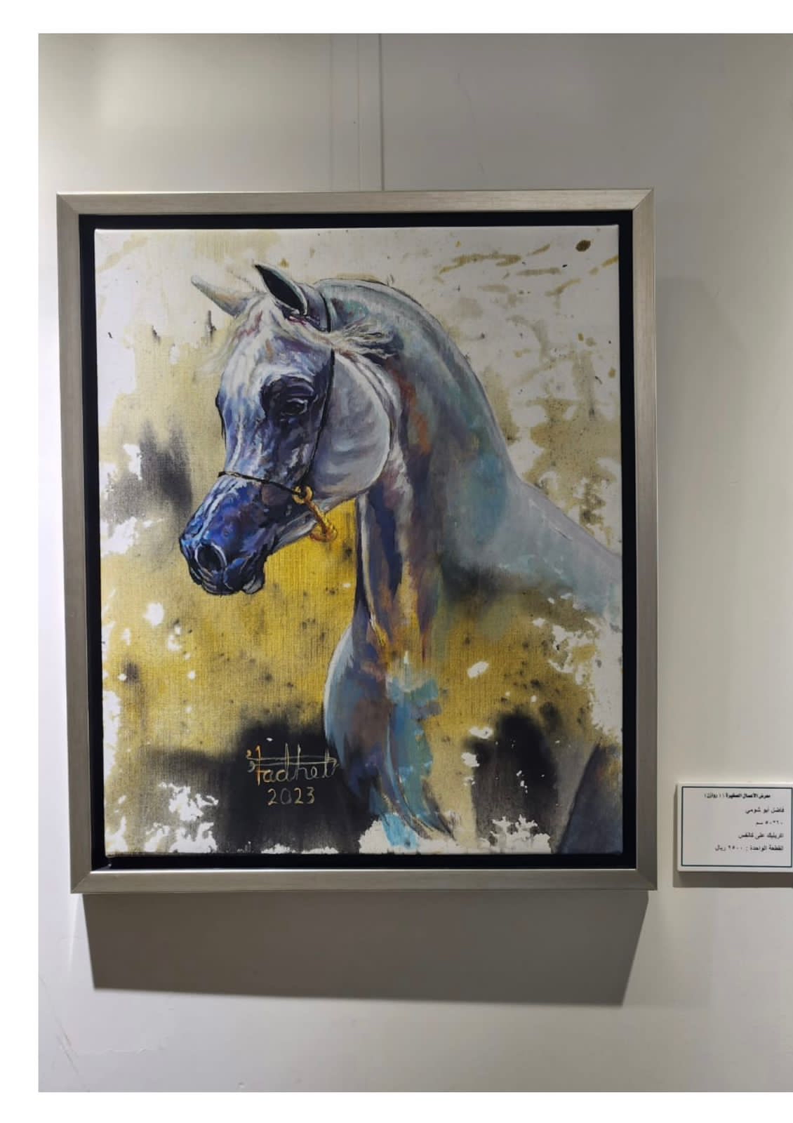 وزينت اللوحة جدران صالة ”علوي الخباز“ التابعة لنادي الفنون بالقطيف، وتميزت بالشفافية في رسم الخيل والملامح العربية الأصيلة التي لاقت استحسان الجمهور والمشاركين في المعرض.