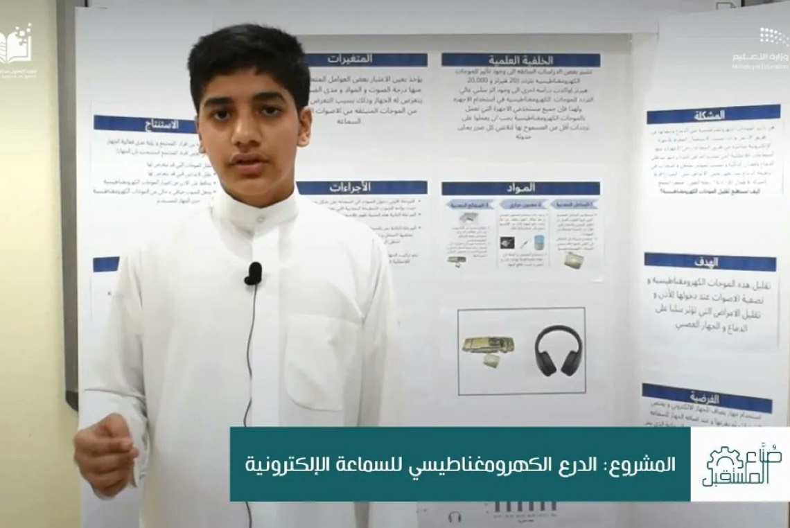 استعرض الطالب علي ماجد آل مسبح من مدرسة البحتري المتوسطة بأم الحمام بالقطيف، مشروعه في مجال الفيزياء تحت عنوان: الدرع الكهرومغناطيسي للسماعة الإلكترونية.
