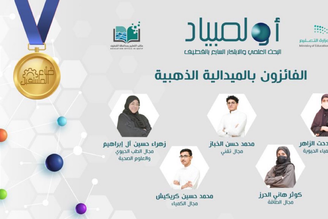 فاز 15 طلاب وطالبات بميداليات ذهبية وفضية وبرونزية في أولمبياد البحث العلمي والابتكار السابع بالقطيف 2023، والذي نظمه مكتب تعليم القطيف خلال المدة 18-20 شوال 1444 هـ.
