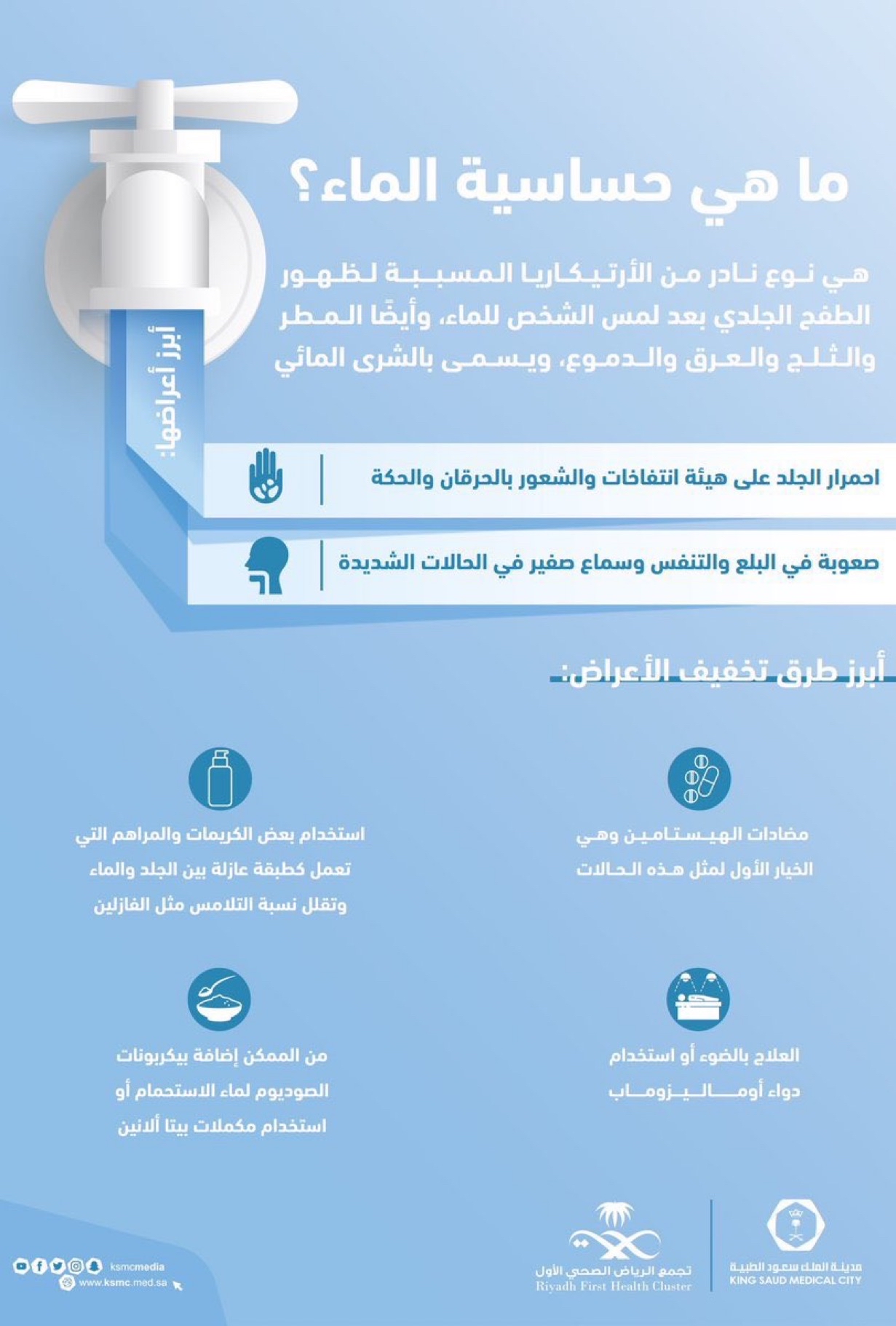كشفت مدينة الملك فهد الطبية، أن أعراض «حساسية الماء»، تتمثل في احمرار الجلد على هيئة انتفاخات، والشعور بالحرقان والحكة، وصعوبة البلع والتنفس، وسماع صفير في الحالات الشديدة.