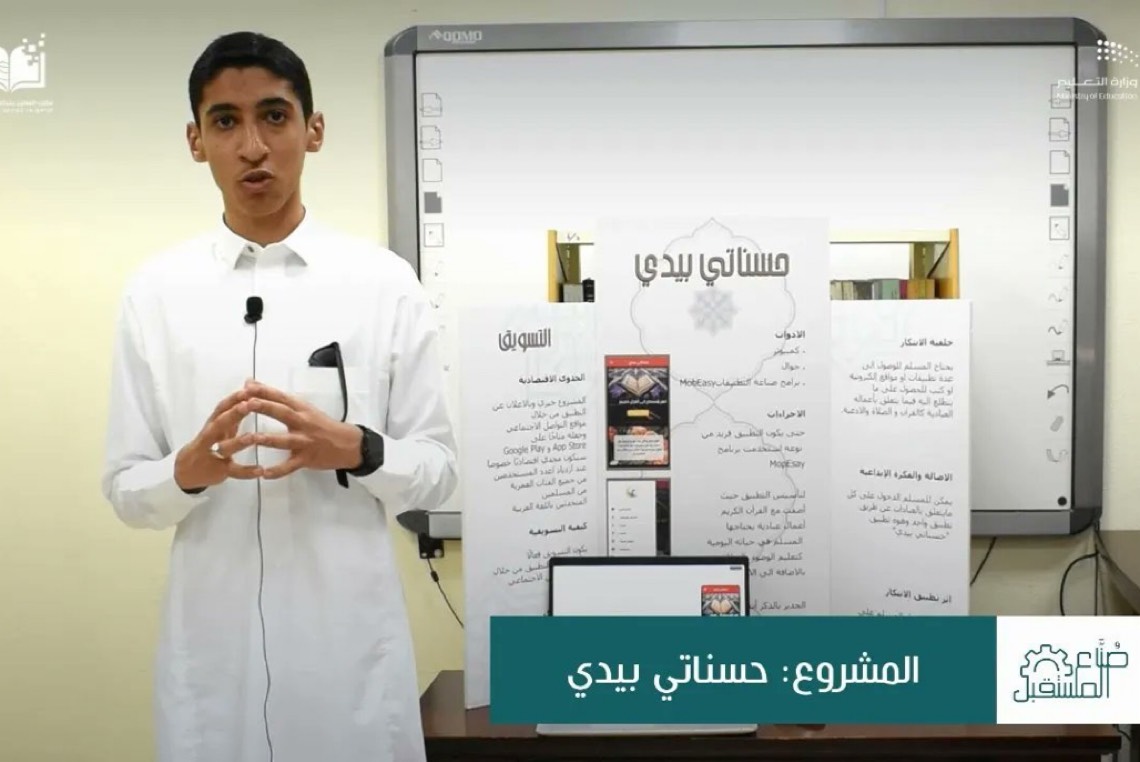استعرض الطالب ”حسين البطران“، من مدرسة مؤتة المتوسطة بالقطيف، مشروعه في مجال التقنية تحت عنوان ”تطبيق حسناتي بيدي، والذي يسهل ويجمع معظم التطبيقات الإسلامية في تطبيق واحد“.