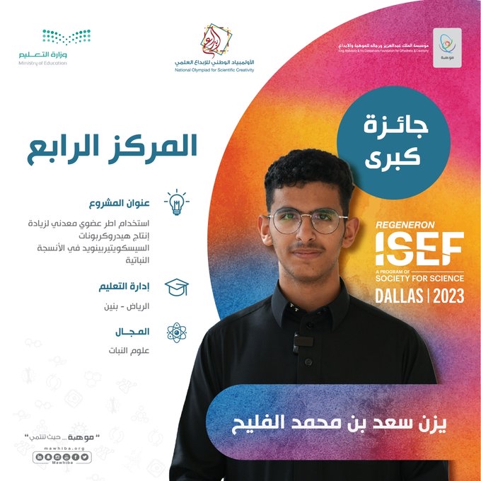 وحصل لطالب يزن الفليح بإدارة تعليم الرياض على المركز الرابع في مجال علوم النبات عن مشروعه المميز ”استخدام أطر عضوي معدني لزيادة إنتاج هيدروكربونات السيسكويتيربينويد في الأنسجة النباتية“.