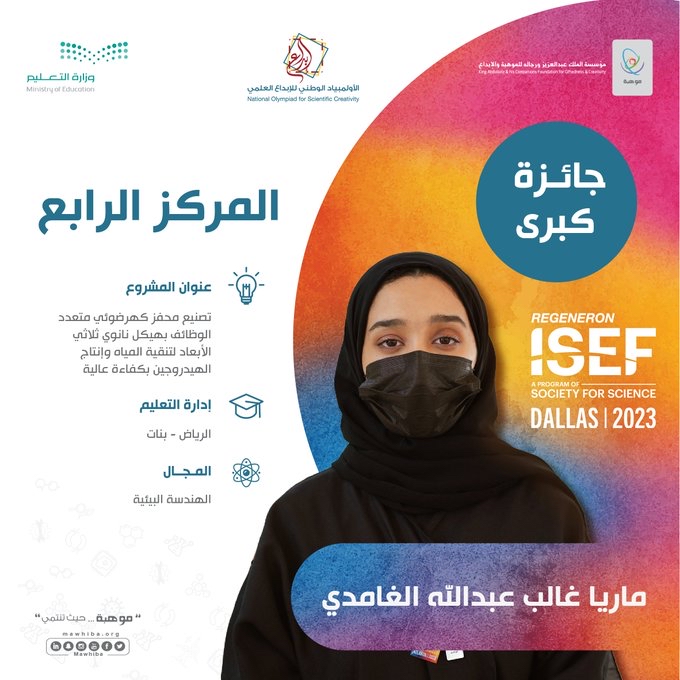 وحصلت الطالبة ماريا الغامدي بإدارة تعليم الرياض على المركز الرابع في مجال الهندسة البيئية، عن مشروعها النّوعي ”تصنيع محفز كهرضوئي متعدد الوظائف بهيكل نانوي ثلاثي الأبعاد لتنقية المياه وإنتاج الهيدروجين بكفاءة عالية“