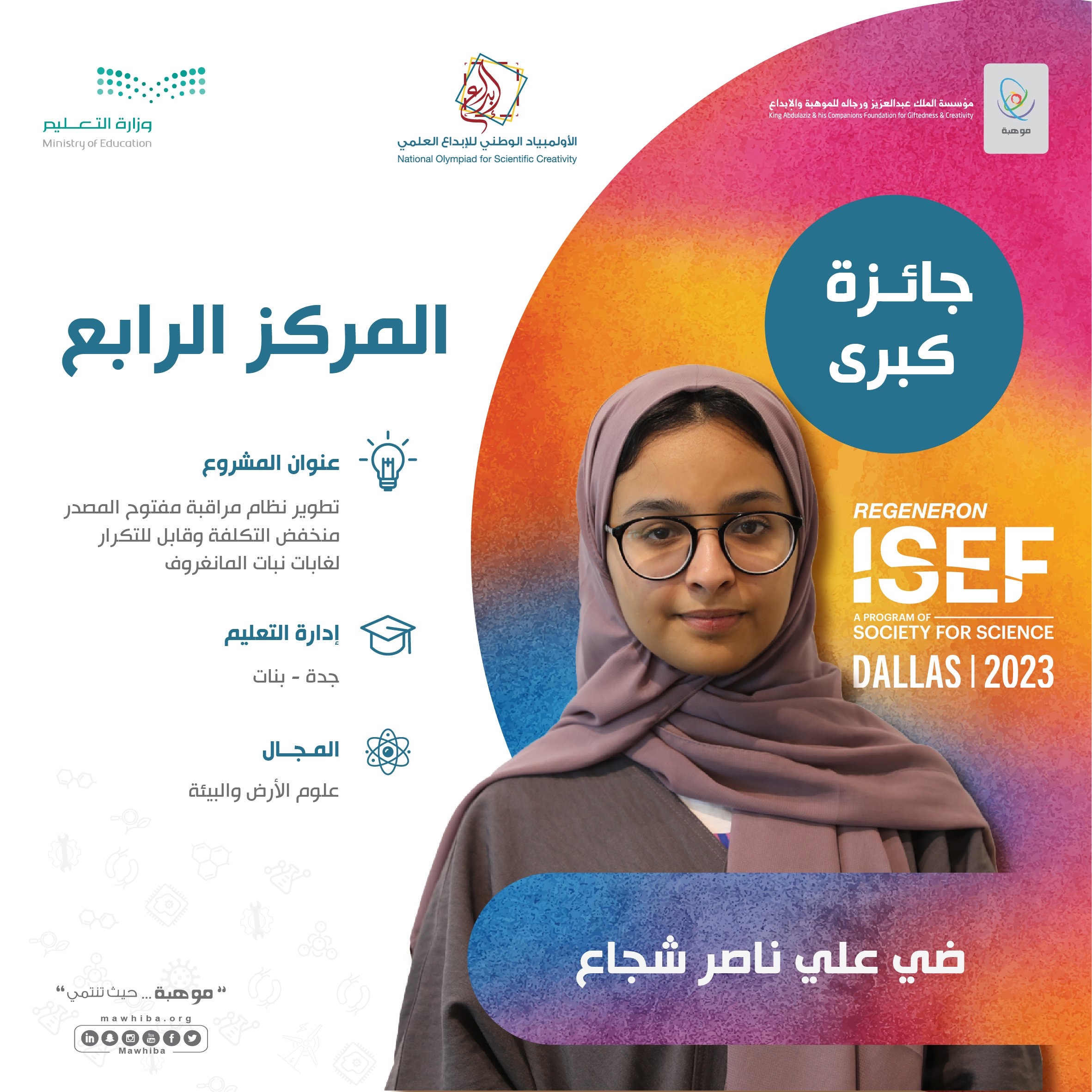 ونالت الطالبة ضي شجاع بإدارة جدة المركز الرابع في مجال علوم الأرض والبيئة عن مشروعها المميز ”تطوير نظام مراقبة مفتوح المصدر منخفض التكلفة وقابل للتكرار لغابات نبات المانغروف“.