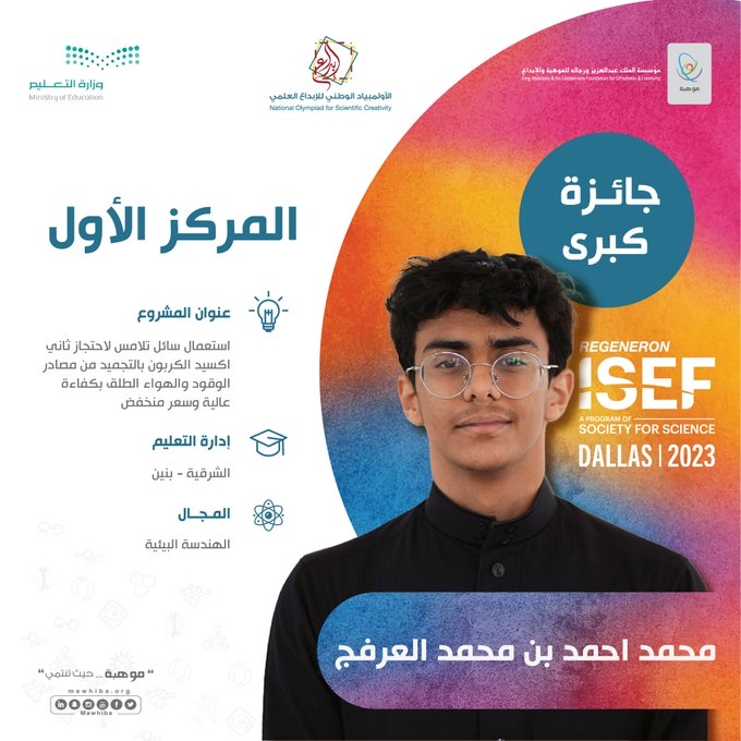 وحقق الطالب محمد العرفج بإدارة تعليم الشرقية المركز الأول في مجال الهندسة البيئية عن مشروعه المميز "استعمال سائل تلامس لاحتجاز ثاني أكسيد الكربون بالتجميد من مصادر الوقود والهواء الطلق بكفاءة عالية وسعر منخفض.