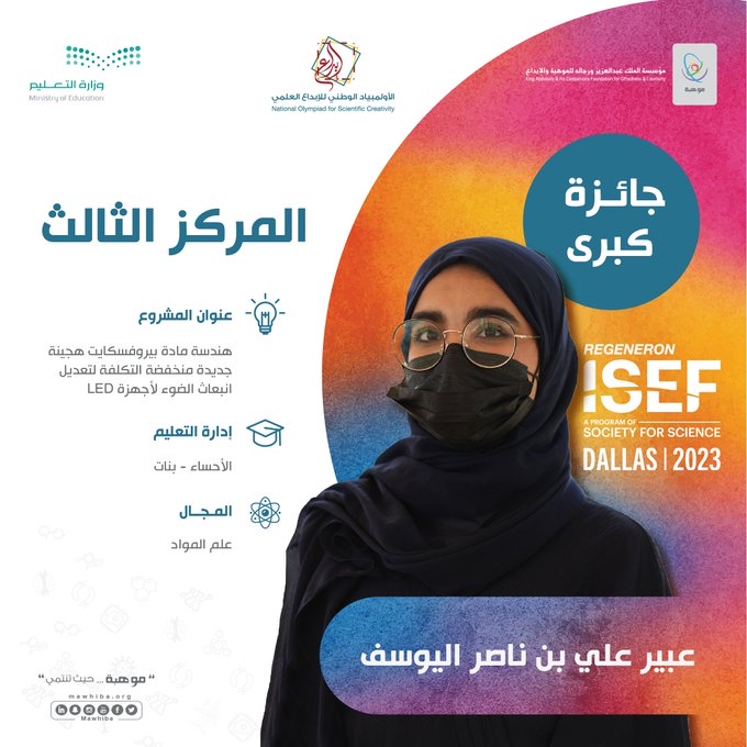 وحصلت الطالبة عبير اليوسف بإدارة تعليم الأحساء بنات، على المركز الثالث في مجال علم المواد عن مشروعها النّوعي "هندسة مادة بيروفسكايت هجينة جديدة منخفضة التكلفة لتعديل انبعاث الضوء لأجهزة LED.