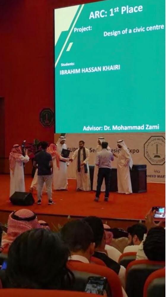 حاز مشروع طالب ”قسم العمارة“ إبراهيم آل خيري، على المركز الأول كأفضل مشروع معماري على مستوى جامعة الملك فهد للبترول والمعادن، في كلية التصميم والبيئة العمرانية ”تخصص العمارة“، وذلك بين 7 مشاريع مقدمة.