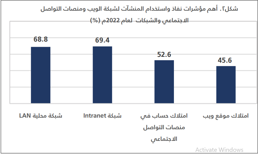 وأكدت نتائج المسح أن 69,4 % من المنشآت لديها شبكة المنشآت التي لديها شبكة محلية بلغت 68,8 %، وكانت المنشآت في نشا ط المال والتأمين الأكثر استخدامًا للشبكة المحلية بنسبة بلغت 87 % تليها أنشطة الصحة والعمل الاجتماعي بنسبة بلغت 83,9 % ثم أنشطة التعليم بنسبة بلغت 83,4%.