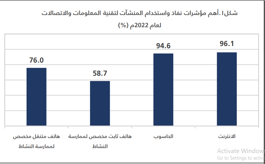 ولفتت إلى أن نسبة المنشآت التي خصصت هاتفًا ثابتًا لممارسة نشاطها الاقتصادي بلغت 58,7%، في حين أن نسبة المنشآت التي خصصت هاتفًا متنقلًا لممارسة النشاط بلغت 76,0%.