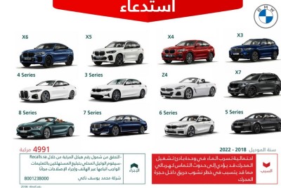 أعلنت وزارة التجارة عن استدعاء 4,991 مركبة من طرازات متعددة لسيارات BMW, تشمل موديلات الأعوام 2018 إلى 2022. ويأتي هذا الإجراء التحرازي نتيجة لاحتمالية تسرب الماء إلى ”وحدة بادئ تشغيل المحرك“، وهو خلل قد يؤدي إلى حدوث تماس كهربائي، وينتج عنه خطر نشوب حريق داخل حجرة المحرك. وشددت الوزارة على ملاك المركبات المشمولة بهذا الاستدعاء، ضرورة التحقق الفوري من شمول أرقام هياكل سياراتهم عبر الموقع الرسمي للاستدعاءات ”recalls.sa“. كما دعتهم إلى التواصل مع... |