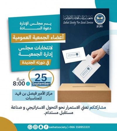 تنعقد جلسة انتخابات مجلس إدارة جمعية سيهات للخدمات الاجتماعية ”سعادة“ في دورته الجديدة، يوم الإثنين 25 سبتمبر، الموافق 10 ربيع الأول، في مركز الأمير فيصل بن فهد للمناسبات. ويتسابق 18 مرشحًا، منهم سيدة واحدة، على تسعة مقاعد، للمضي قدمًا في إدارة ملف التنمية، الذي يتبناه المركز الوطني لتنمية القطاع غير الربحي، وفقًا لمستهدفات رؤية المملكة 2030. وتولي الرؤية، القطاع، أهمية كبرى على الصعيدين الاجتماعي والاقتصادي من خلال تنظيم دور منظمات القطاع غير... |
