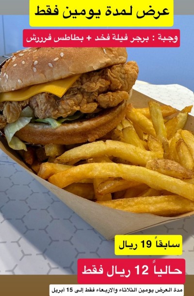 اليوم وبكرة: وجبة برجر فيلية مع بطاطس ب 12 ريال