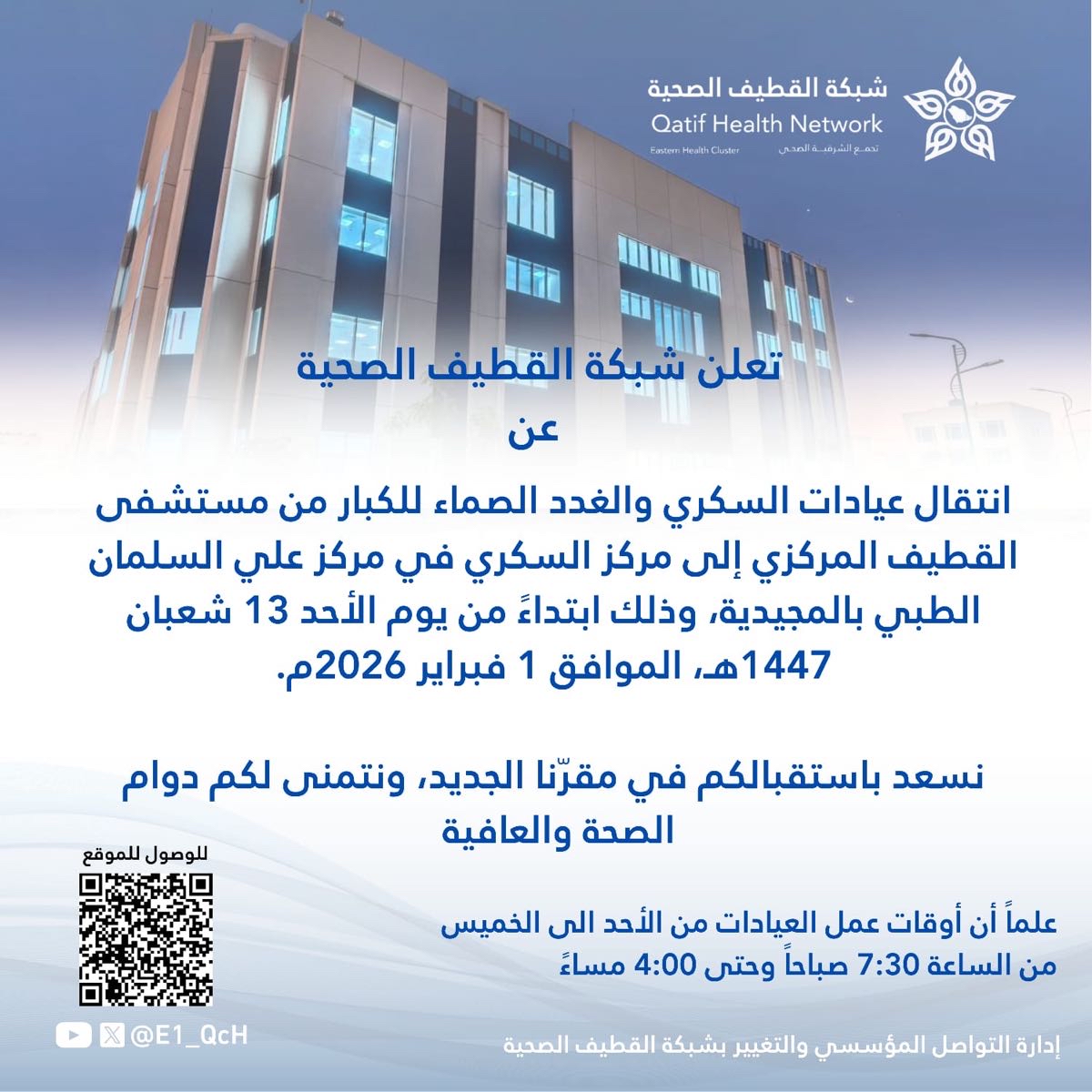 وأكدت الشبكة أن العمل في المقر الجديد سيبدأ فعلياً اعتباراً من تاريخ 13 شعبان 1447 هـ، الموافق للأول من فبراير لعام 2026 م، لضمان استمرارية تقديم الرعاية الصحية دون انقطاع.