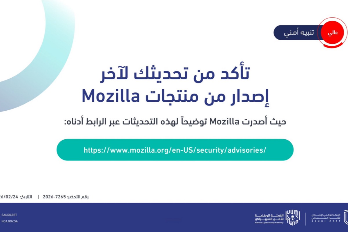 حذر المركز الوطني للأمن السيبراني مستخدمي منتجات ”موزيلا“ من ثغرات أمنية خطيرة، داعياً للمسارعة بتثبيت التحديثات لسد الثغرات وحماية سرية البيانات من هجمات إلكترونية محتملة.