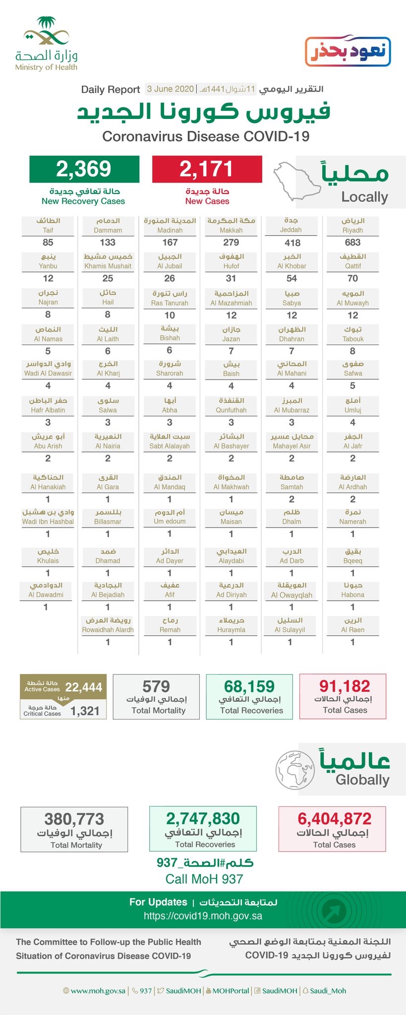 وتم تسجيل 2369 حالة تعافٍ جديدة، منها 21 في القطيف لترتفع الحالات الإجمالية للتعافي إلى 68159 حالة (75 % من إجمالي الإصابات المسجلة).